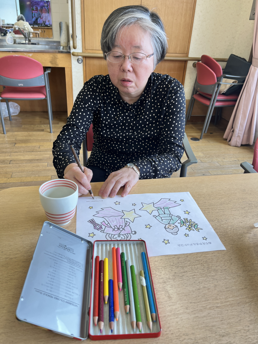 テレビを見ながら塗り絵をします。とても綺麗に塗れました