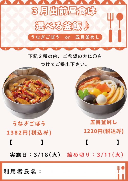 2025.02.27 【仲町在セン】3月出前昼食のお知らせです☆ 活動報告 #奉優会 #仲町高齢者在宅サービスセンター #出前昼食 #3月 #釜めし 2024.09.25 【仲町在セン】出前昼食☆~釜めしを楽しみました~② 活動報告 #奉優会 #仲町高齢者在宅サービスセンター #仲町在セン #出前昼食 #釜めし 2024.09.25 【仲町在セン】出前昼食☆~釜めしを楽しみました~① 活動報告 #仲町高齢者在宅サービスセンター #奉優会 #出前昼食 #釜めし