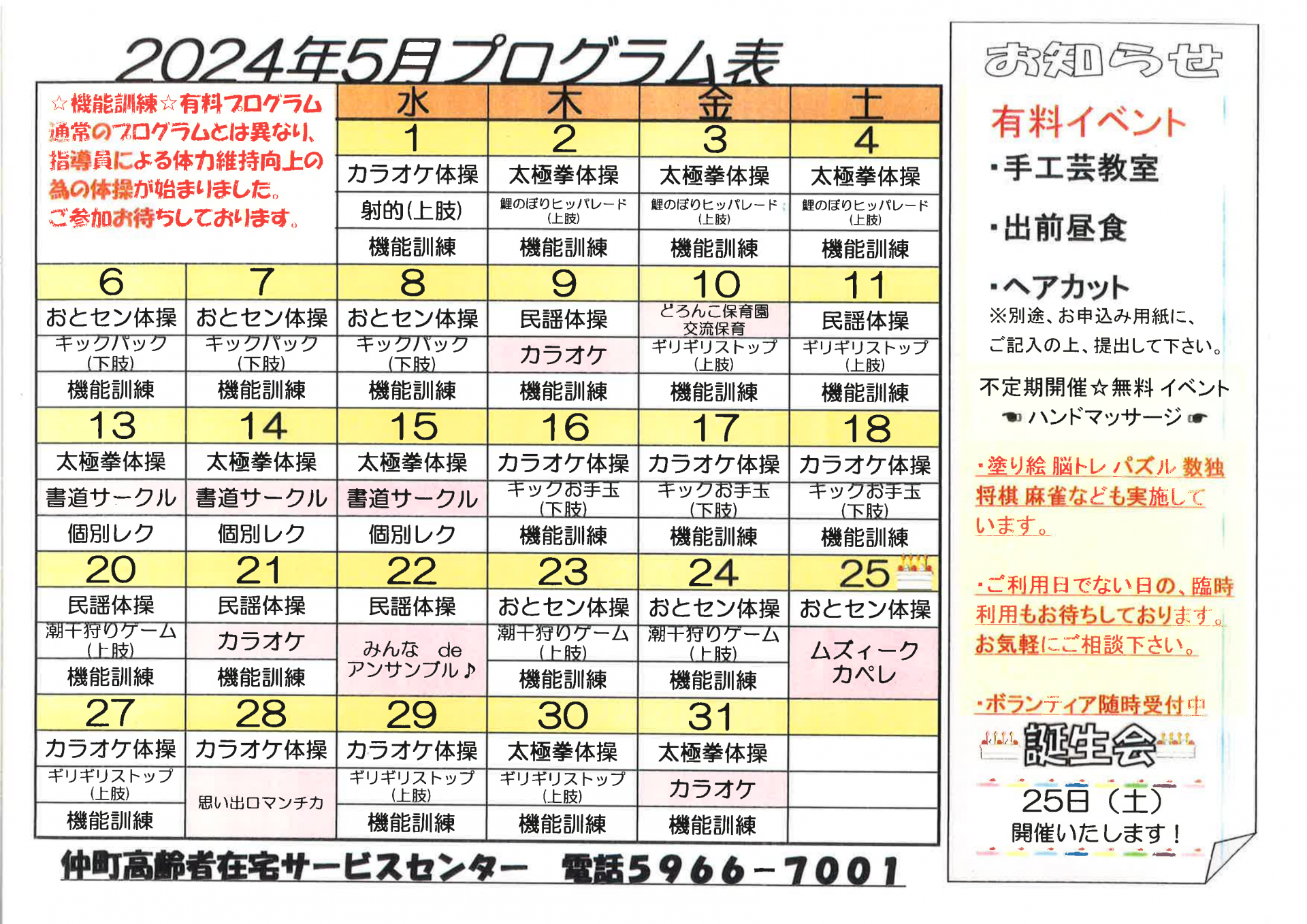 遅くなってしまいましたが、5月のプログラム表です(*_ _)