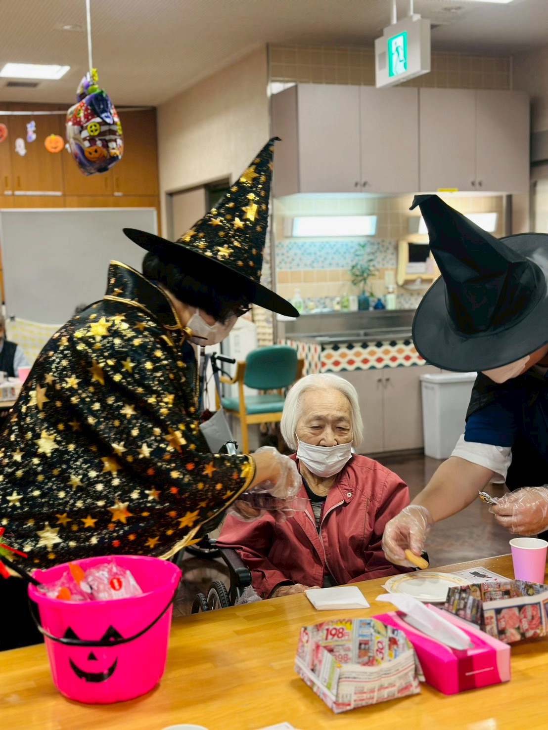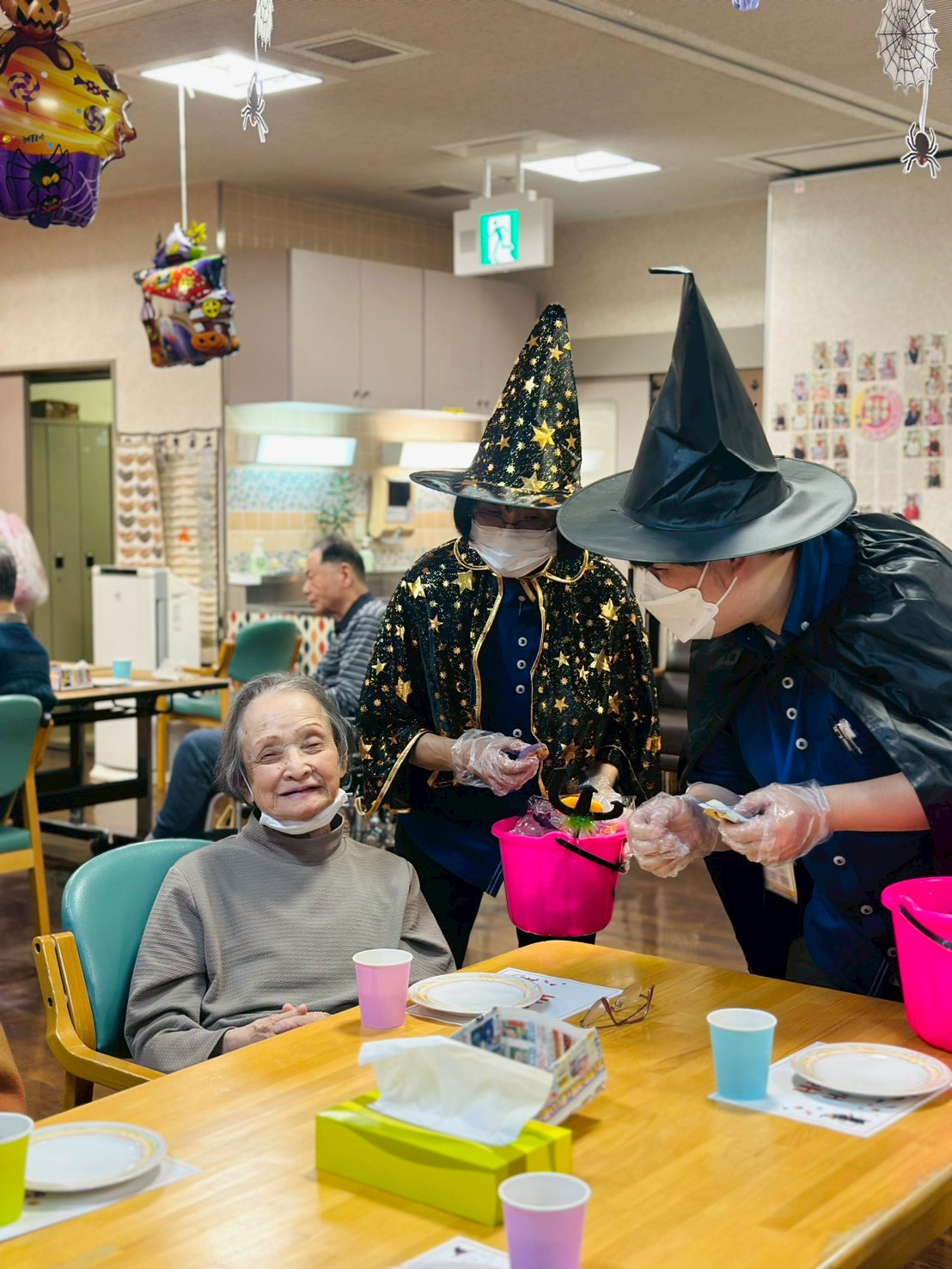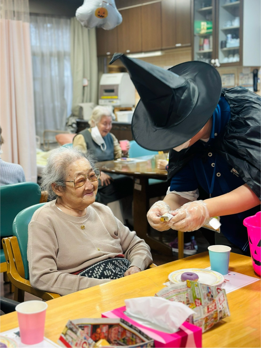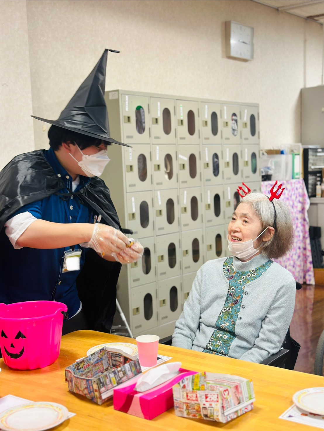 仮装した職員が利用者さんにお菓子をお配りしています♪