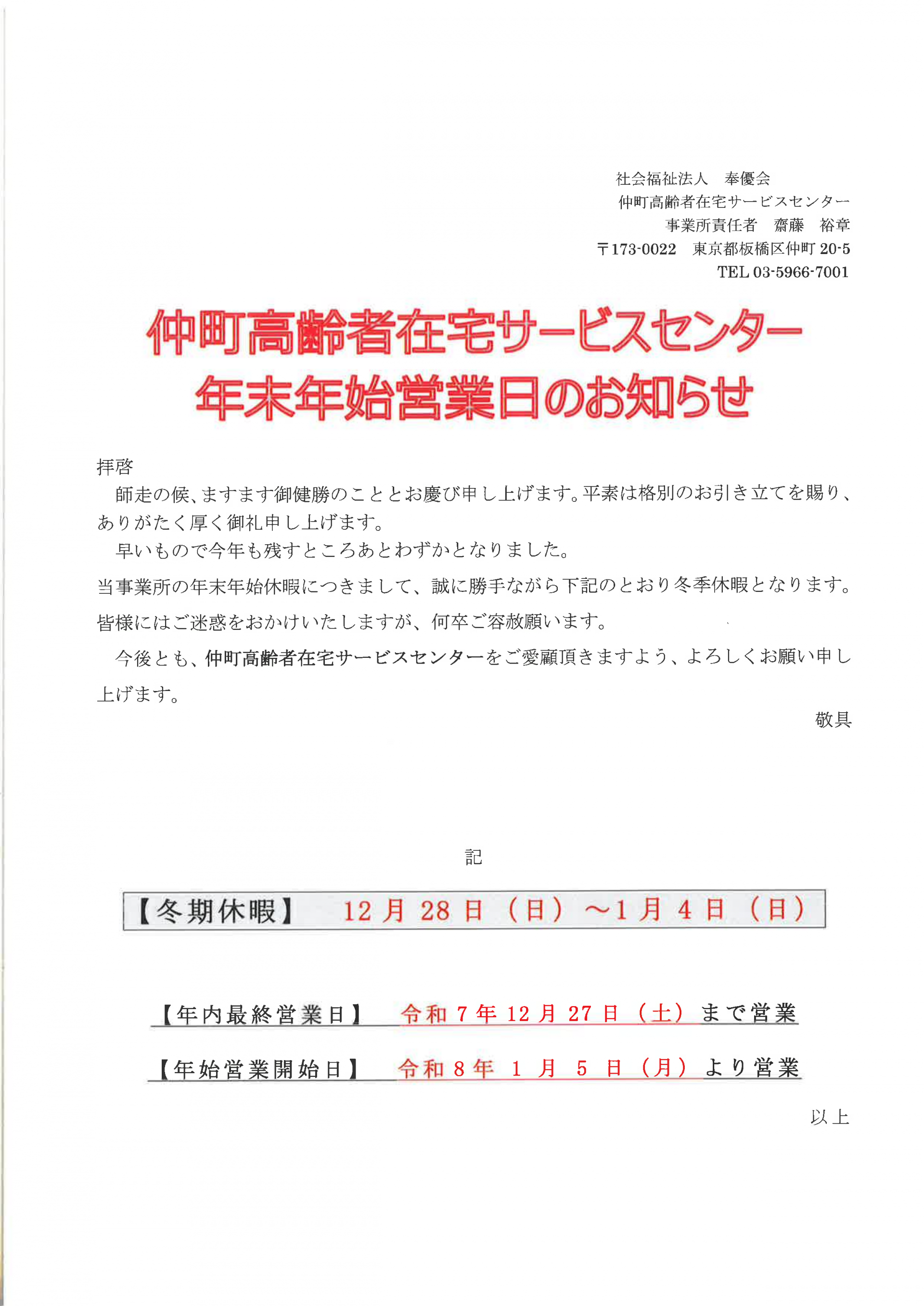さて、今回は仲町高齢者在宅サービスセンターの年末年始のお休みのお知らせです!