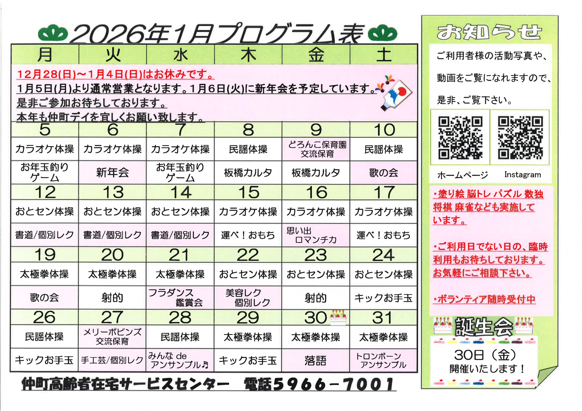 【仲町在セン】1月のプログラム表です☆