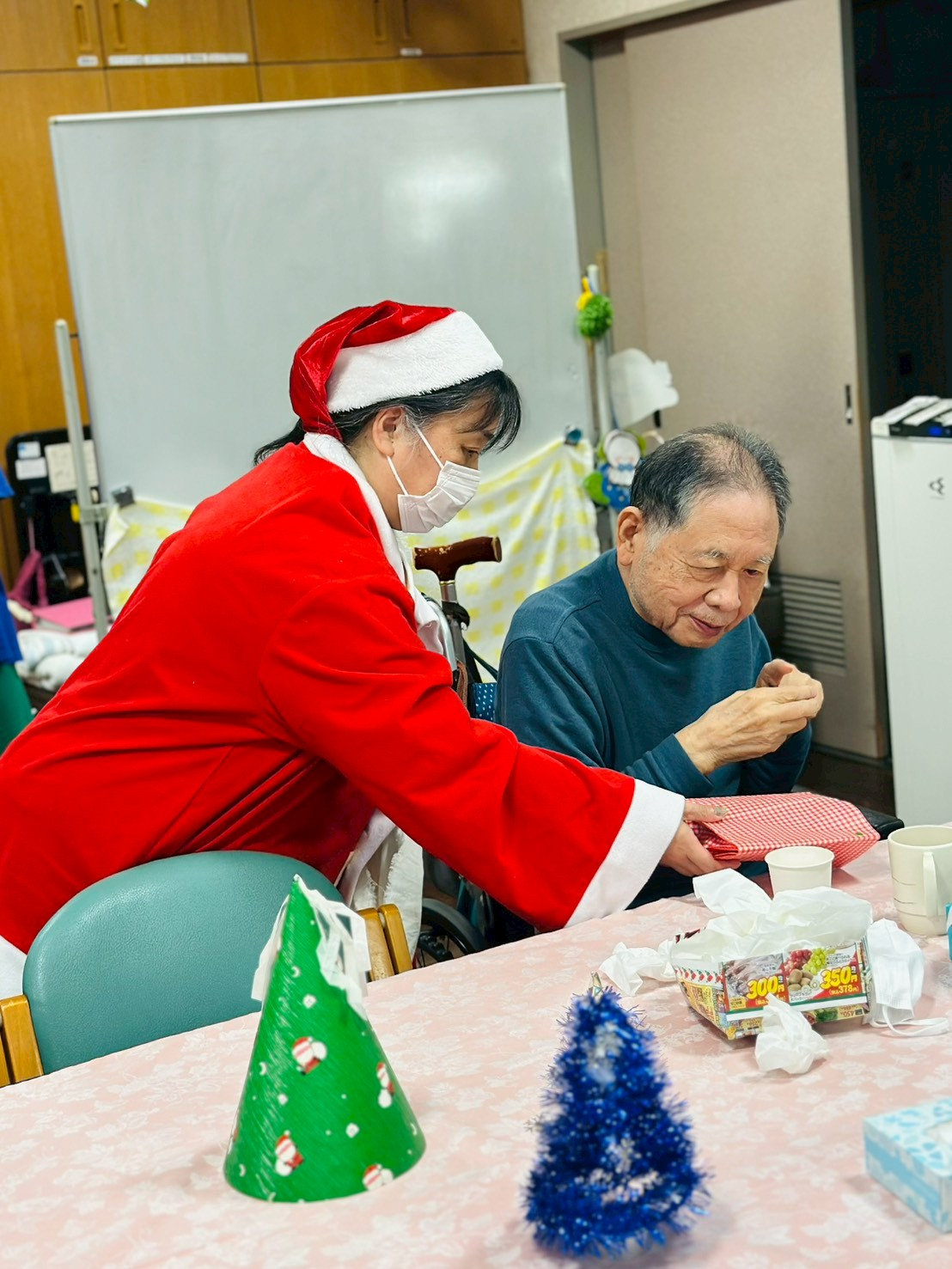 サンタクロース衣装の職員がプレゼントをお配りまわっております!