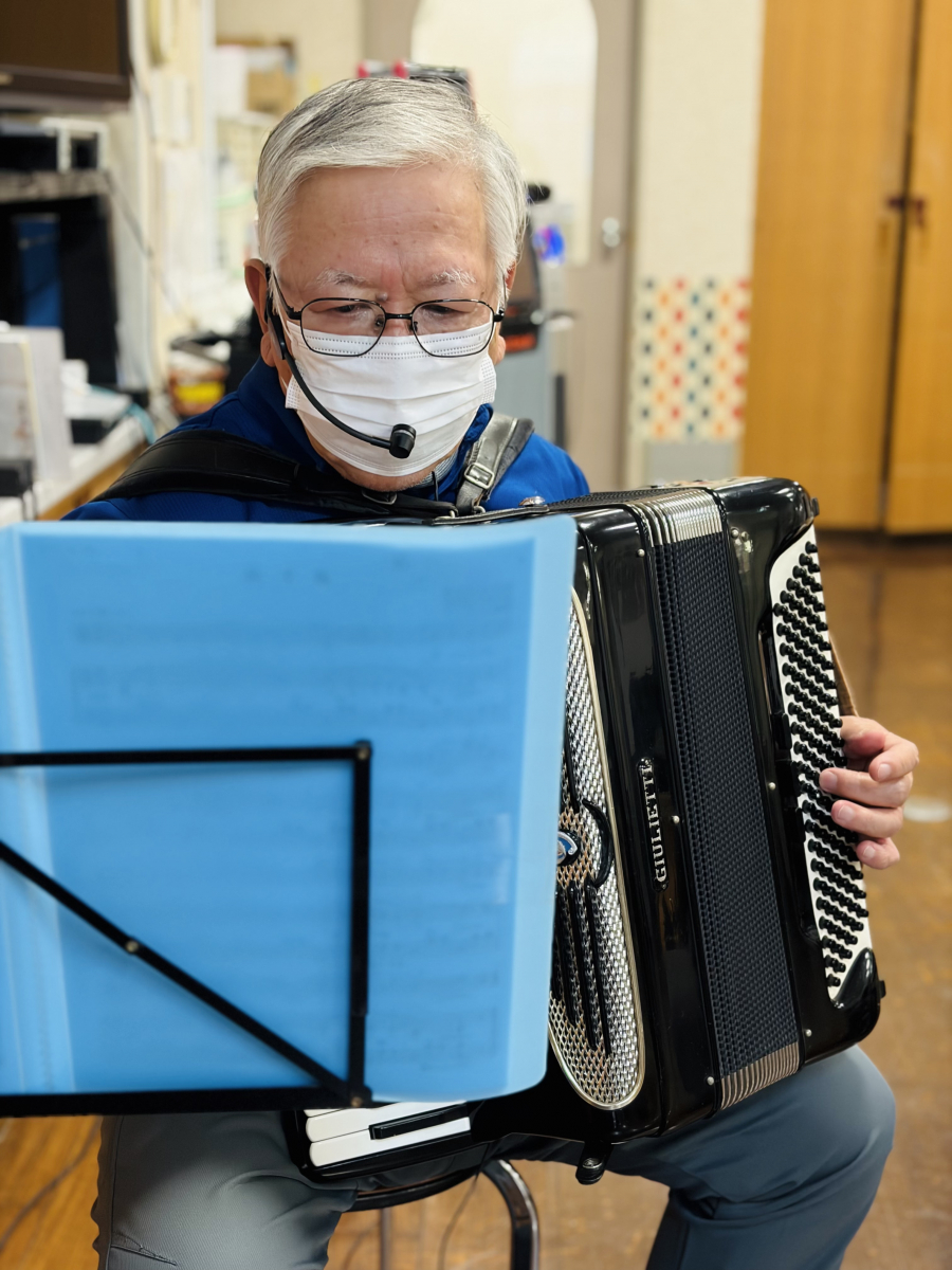 職員のアコーディオン伴奏、ご利用者様はタンバリン、すず、カスタネットを選んでいただき、