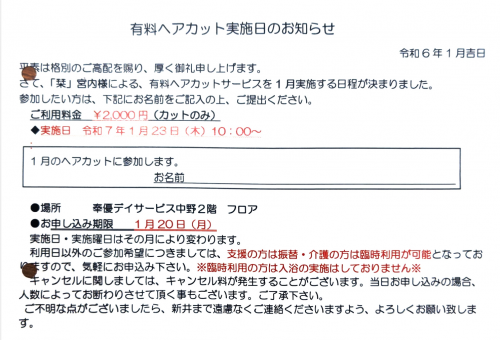 2025.01.31 【中野デイ】お楽しみイベント! 活動報告 2025.01.30 【中野デイ】臨床美術! 活動報告 2025.01.24 【中野デイ】合同誕生日会! 活動報告 2025.01.20 【中野デイ】トルト実施 週間! 活動報告 2025.01.20 【中野デイ】カラオケ大会♪ 活動報告 2025.01.16 【中野デイ】サックス演奏会♪ 活動報告 2025.01.15 【中野デイ】手工芸 節分飾り 活動報告 2025.01.13 【中野デイ】叩いて被って、、じゃんけんポン 活動報告 2025.01.10 【中野デイ】篠笛演奏会♪ 活動報告 2025.01.09 【中野デイ】物送りゲーム 活動報告 2025.01.08 【中野デイ】ヘアカットのお知らせ! 活動報告 2025.01.07 【中野デイ】大相撲 中野場所 活動報告 2025.01.06 【中野デイ】タイムバスケット! 活動報告 2025.01.06 【中野デイ】新年会のおしらせ 活動報告 2025.01.04 【中野デイ】1月のプログラム表 活動報告 1 … 6 7 8 9 10 … 25
