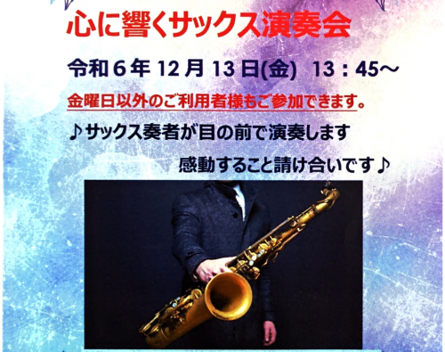 2025.01.04 【中野デイ】謹賀新年! 活動報告 2024.12.28 【中野デイ】最終日! 活動報告 2024.12.25 【中野デイ】Xmas会 活動報告 2024.12.20 【中野デイ】イケメンブラザース♪ 活動報告 2024.12.18 【中野デイ】門松作り 活動報告 2024.12.16 【中野デイ】フェスタ落語会 活動報告 2024.12.13 【中野デイ】サックス演奏会♪ 活動報告 2024.12.12 【中野デイ】ピアノ&バイオリンコラボ演奏会♪ 活動報告 2024.12.11 【中野デイ】外出イベント!! 活動報告 2024.12.10 【中野デイ】デザートバイキング 活動報告 2024.12.07 【中野デイ】クリスマス飾り! 活動報告 2024.12.05 【中野デイ】ターゲットボール 活動報告 2024.12.02 【中野デイ】イベントのお知らせ ③ 活動報告 2024.12.02 【中野デイ】イベントのお知らせ ② 活動報告 2024.12.02 イベントのお知らせ ① 活動報告 1 … 7 8 9 10 11 … 25