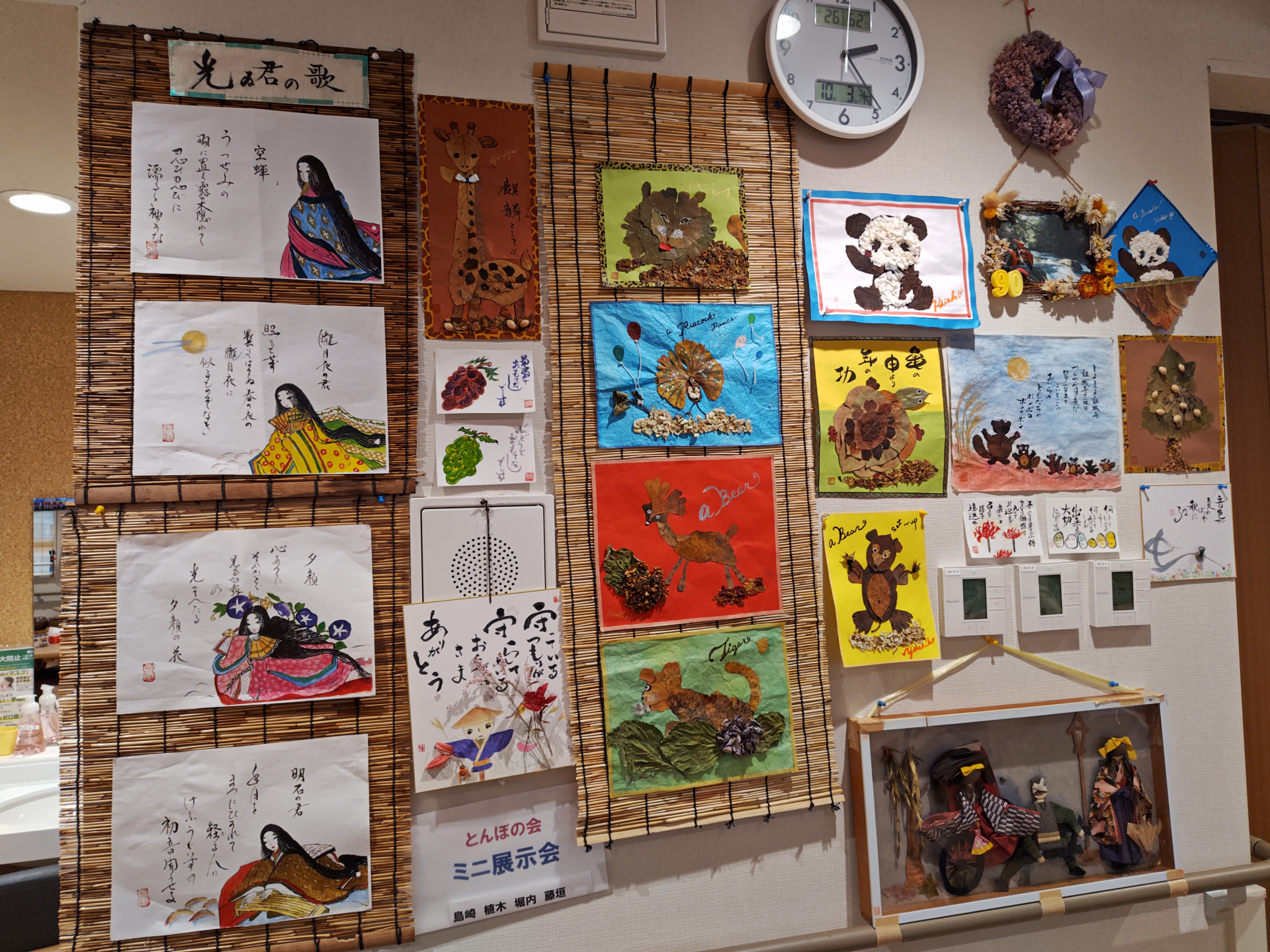 デイルームの入口入って右側の壁画です。作品がたくさん貼られています。
