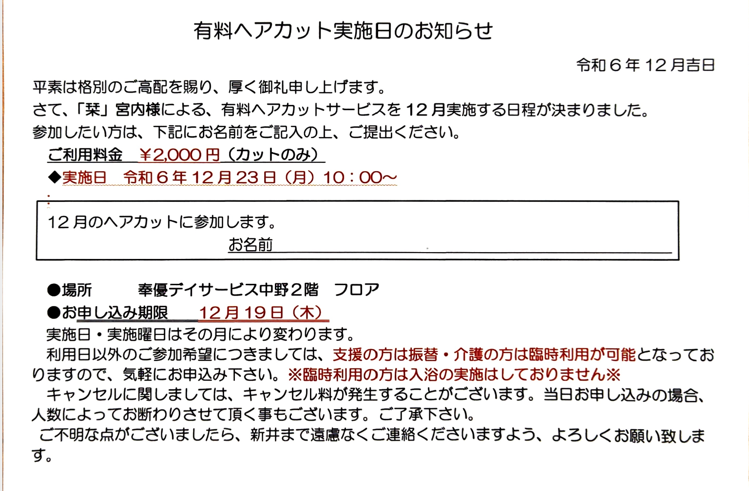 お待たせしました!!12月のヘアカットサービスの実施日は23日(月)に決定しました。
