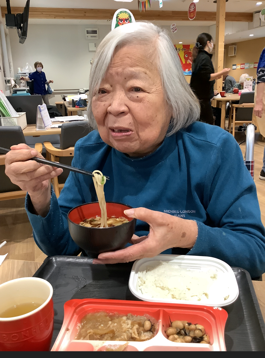 本日はデイ最終日となりました。今日の昼食には「年越しそば」とおやつには「甘酒」をご用意させて頂きました。