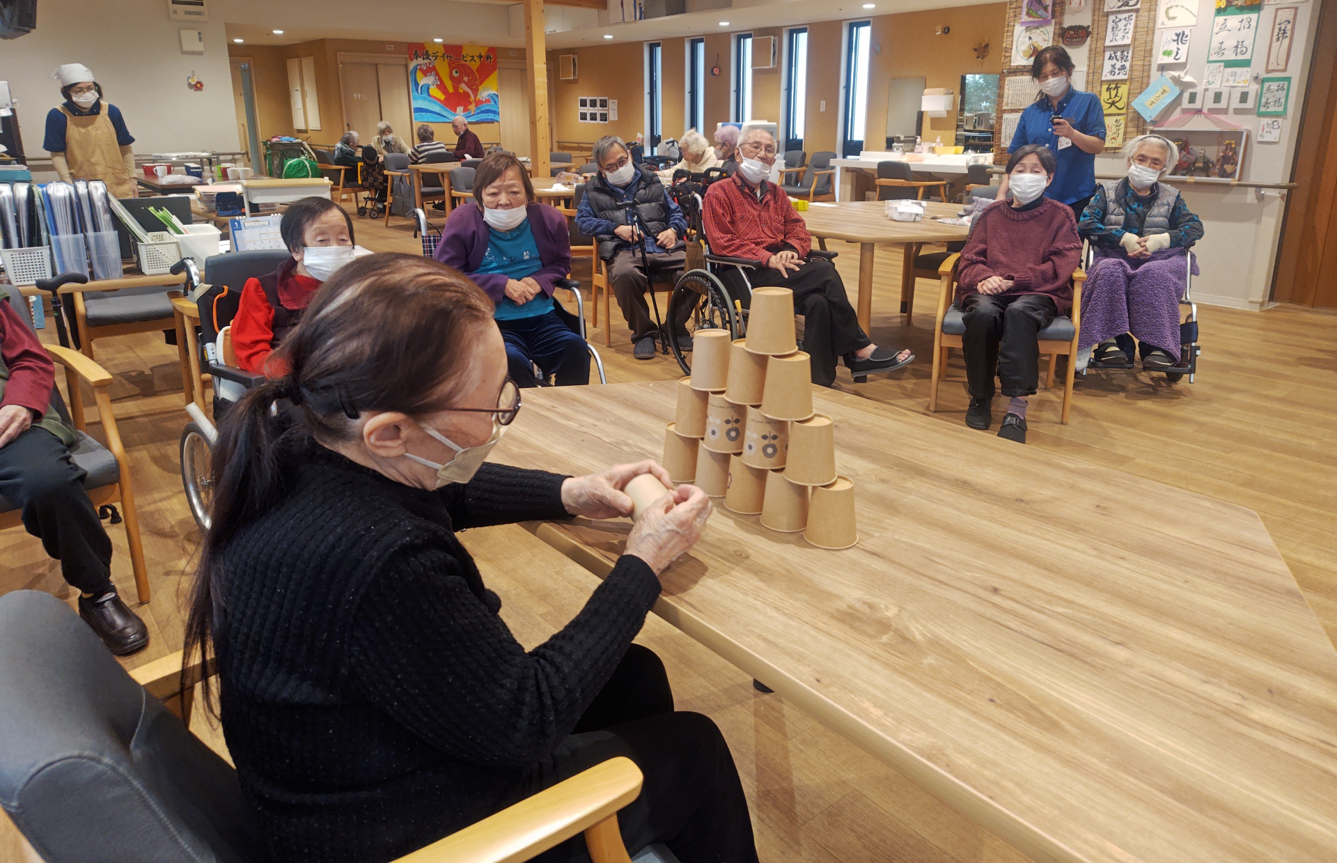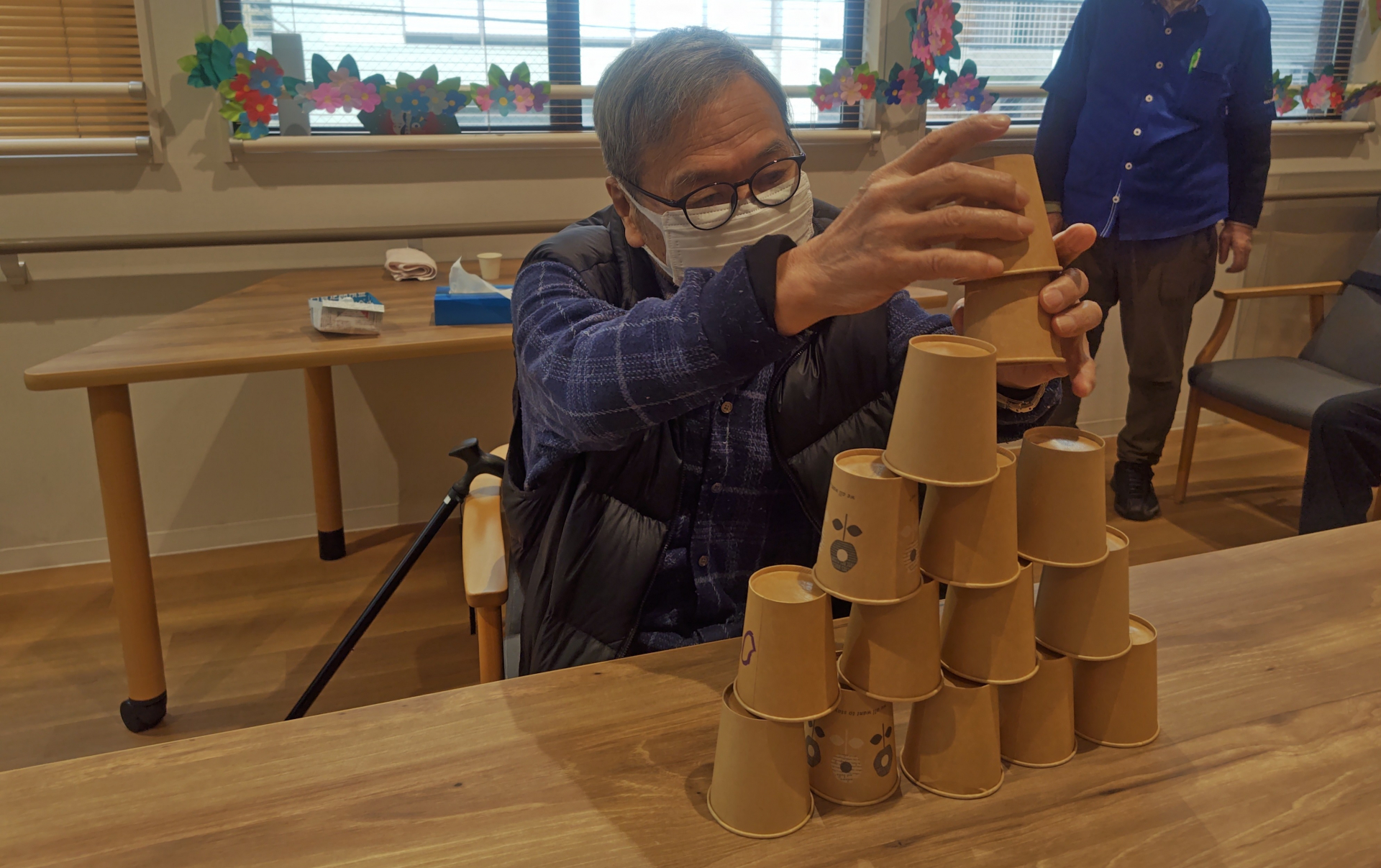 本日の上肢筋力向上ゲームは「紙コップタワー」が行われました。