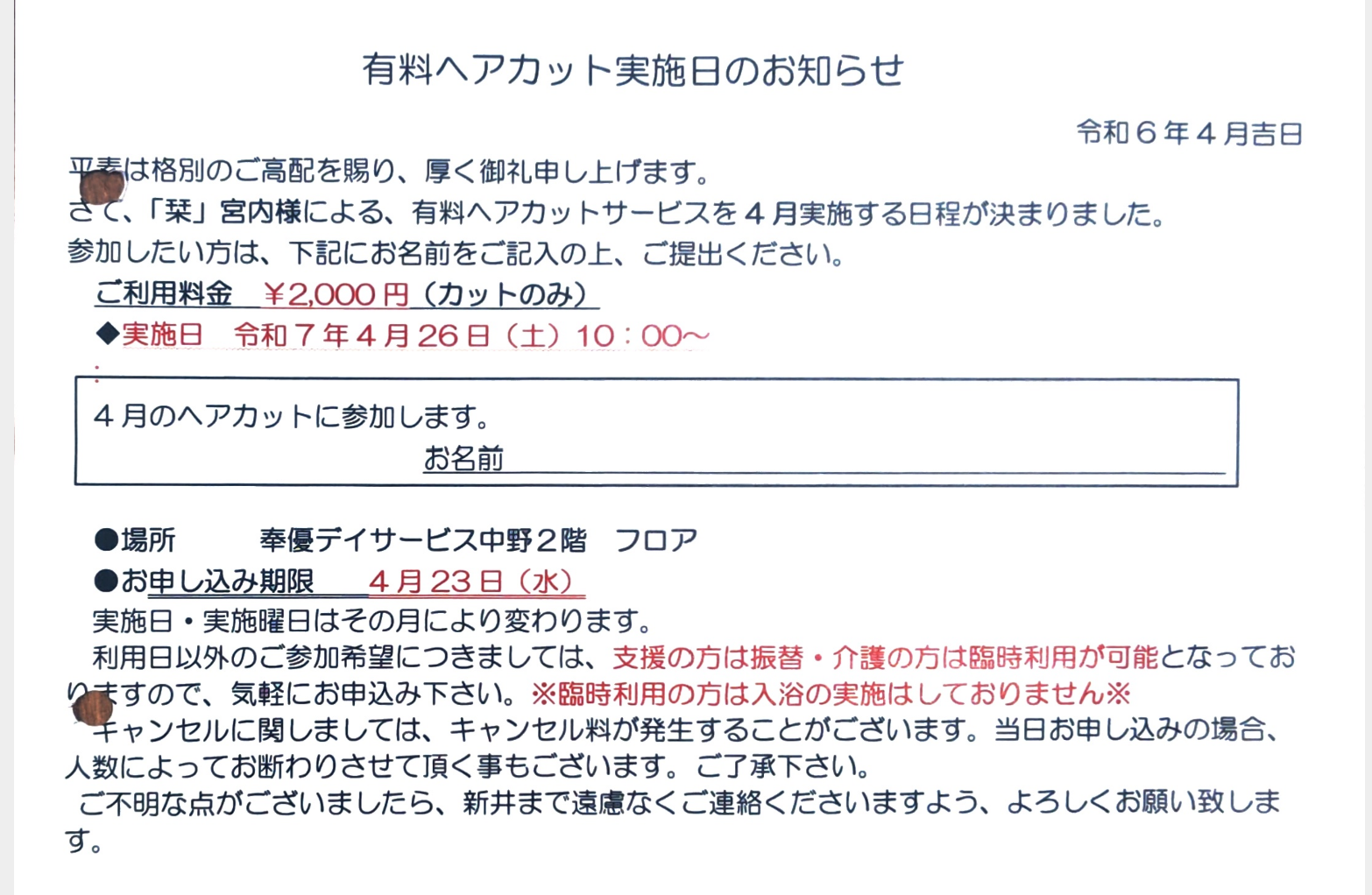【中野デイ】ヘアカットサービス!!