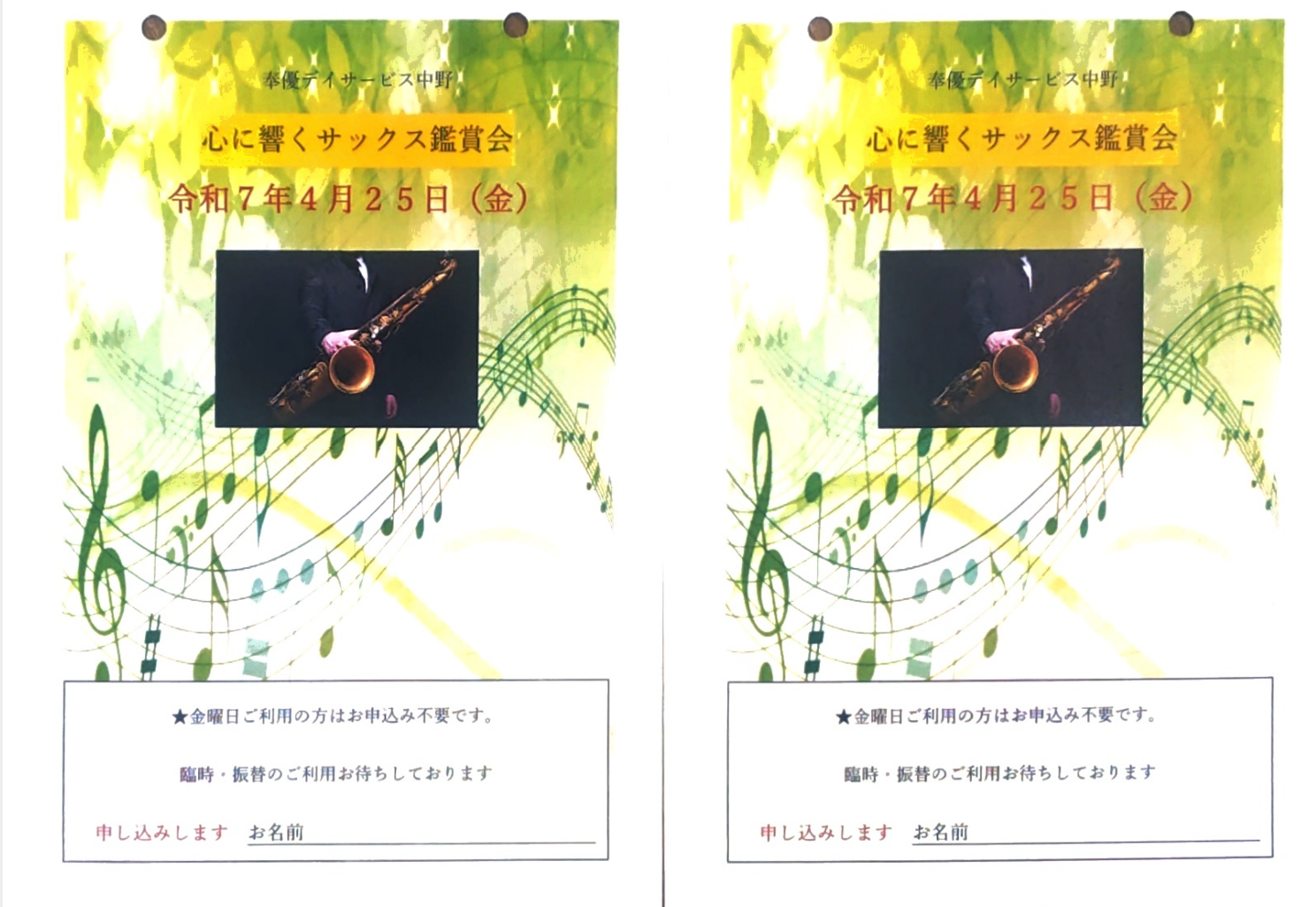 本日は4月の後半のイベントの一部をご紹介させていただきます。毎月恒例で人気のサックス演奏会♪です25日(金)午後から開催されます。