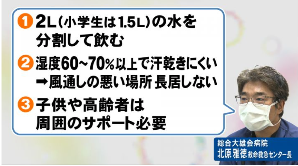 梅雨型熱中症の予防として水分を分割してこまめに補給し、湿度の高い風通しの悪いところでは長居は禁物です。