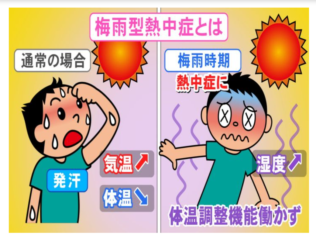 梅雨の時期ですがこの時期湿度が高いと汗をかいても蒸発しないで熱がこもり体温を下げる事が出来ず熱中症のリスクが高くなります。