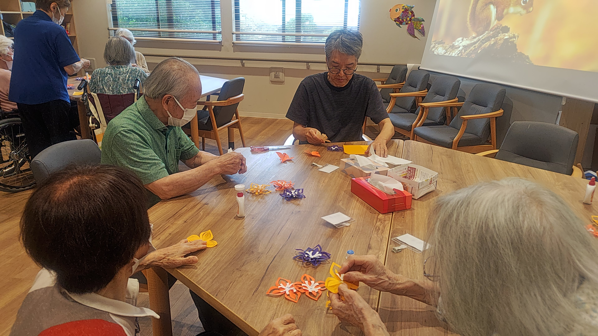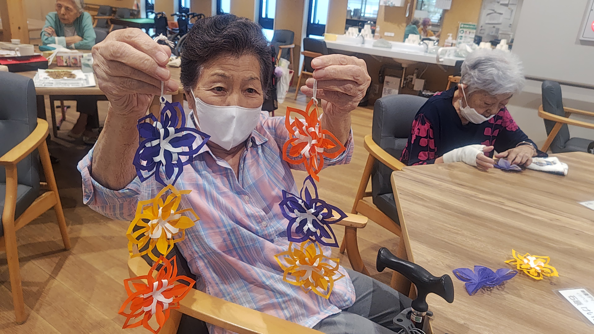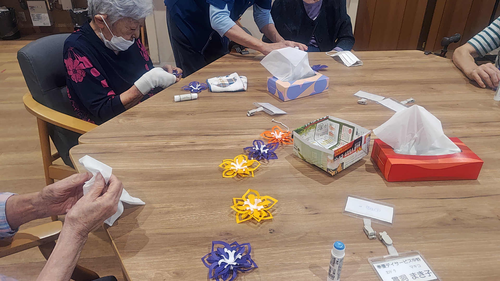 本日はハローウインの壁飾りの一部で花を作成しました!(^^)! 細かい作業に真剣に取り組まれています。