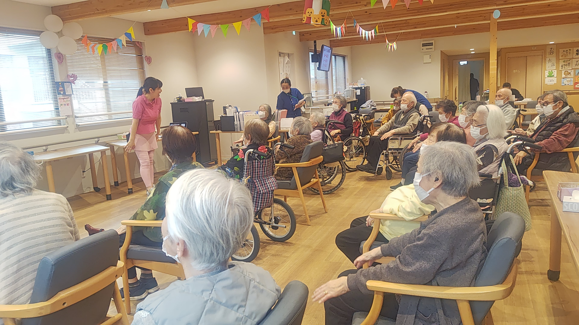 皆様色々なワードを言った後に笑ったり、様々なラフターエクササイズを皆様と実践してデイルームが笑いに包まれていました。