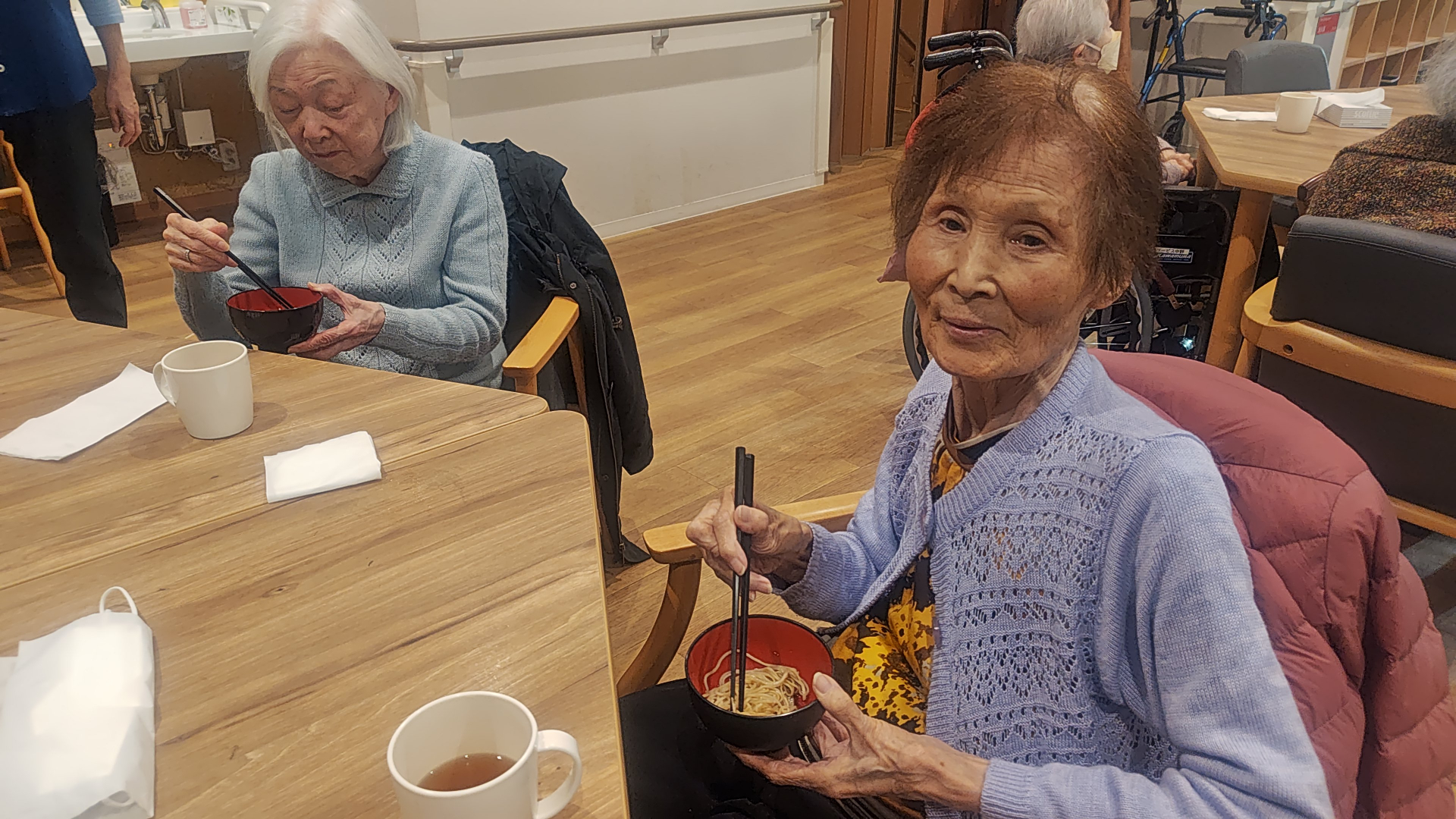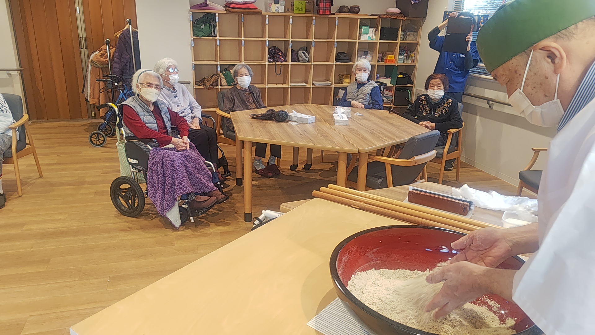 本業は染物屋さんらしく、ご利用者のH様のマンションの向かいとの事でご夫婦を見てすぐお声掛けをしていました。ただそば打ち五段で確かな技術で皆様に披露して頂きました。