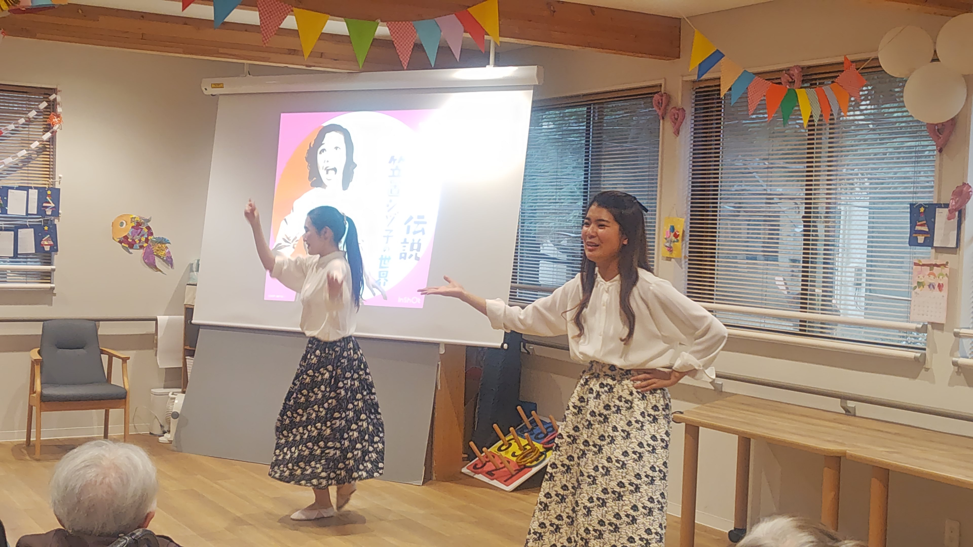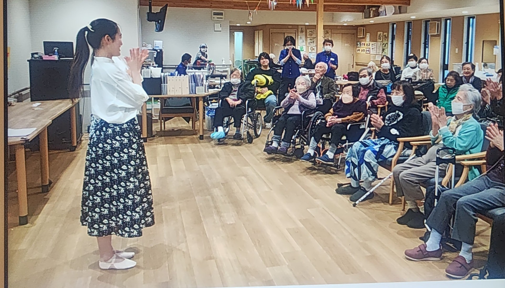 加來さんの「くるみ割り人形」のクラッシックバレーからスタートし、中村さんの迫力の声量でのヨーデルにご利用者様も圧倒され、お二人の歌と踊りに魅了されていました。