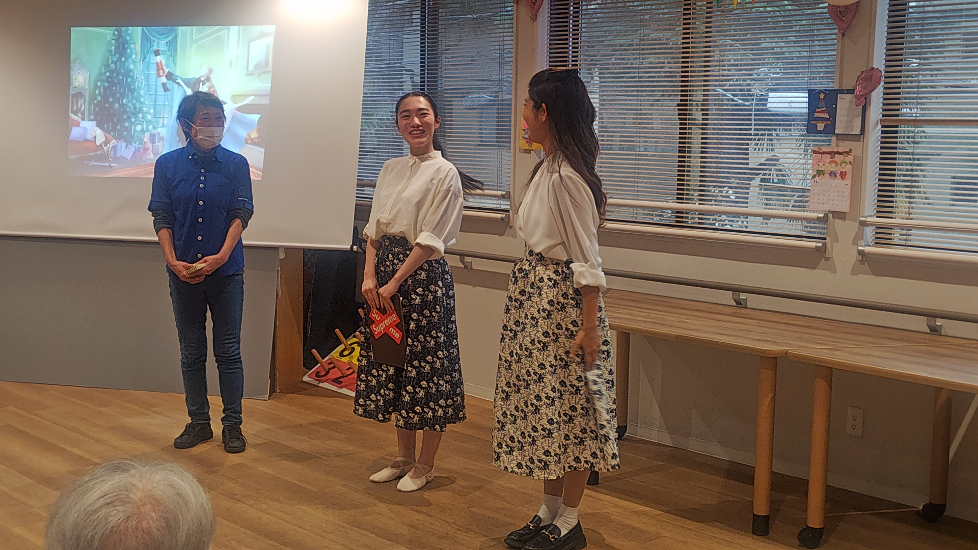 本日は歌とクラッシックバレーのショーが行われました。I職員が若い頃在籍していた劇団の同期の友人の紹介で加來梨夏子さん(民藝)と友人の中村泉さんによるショーが開催されました。