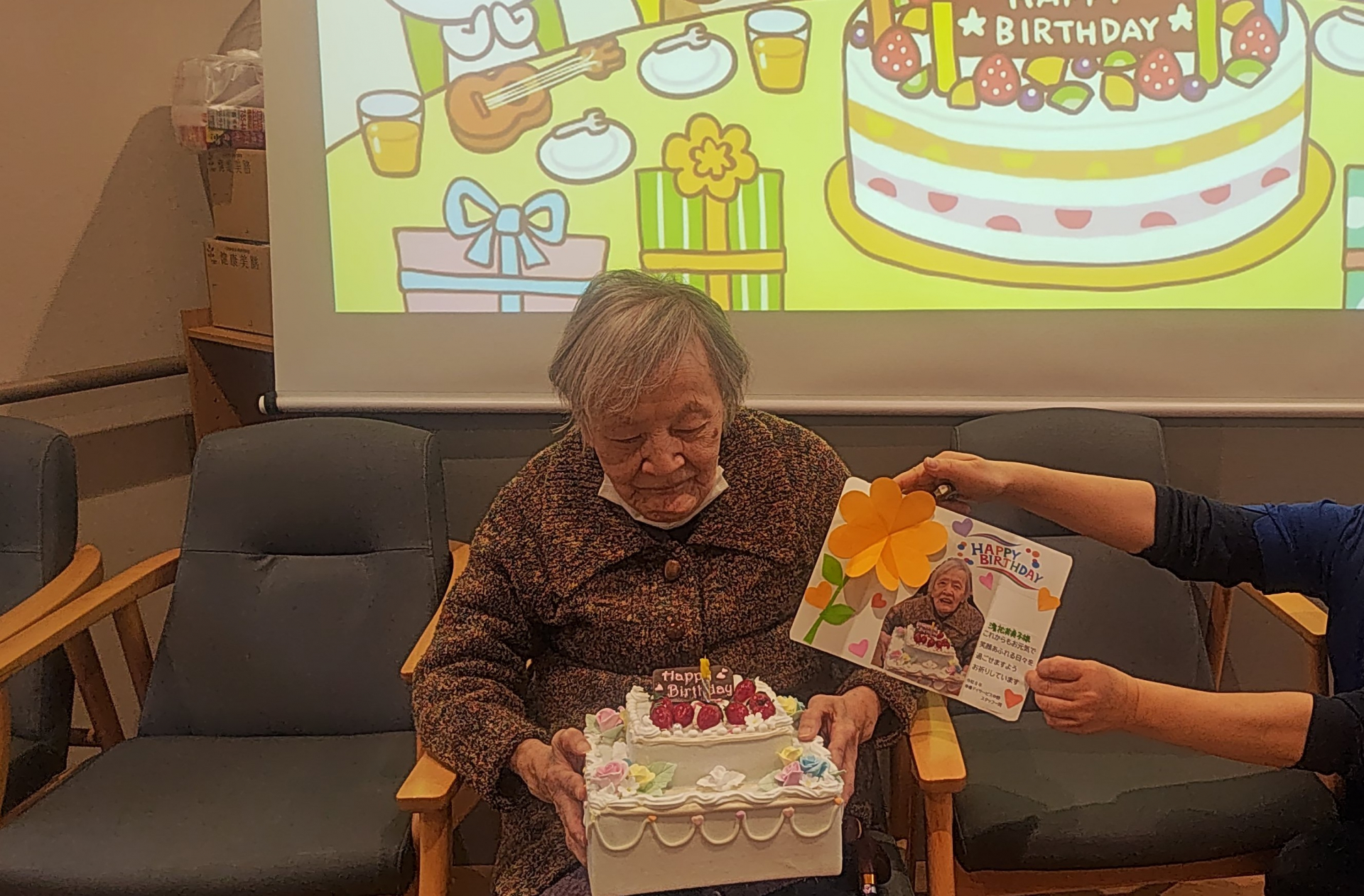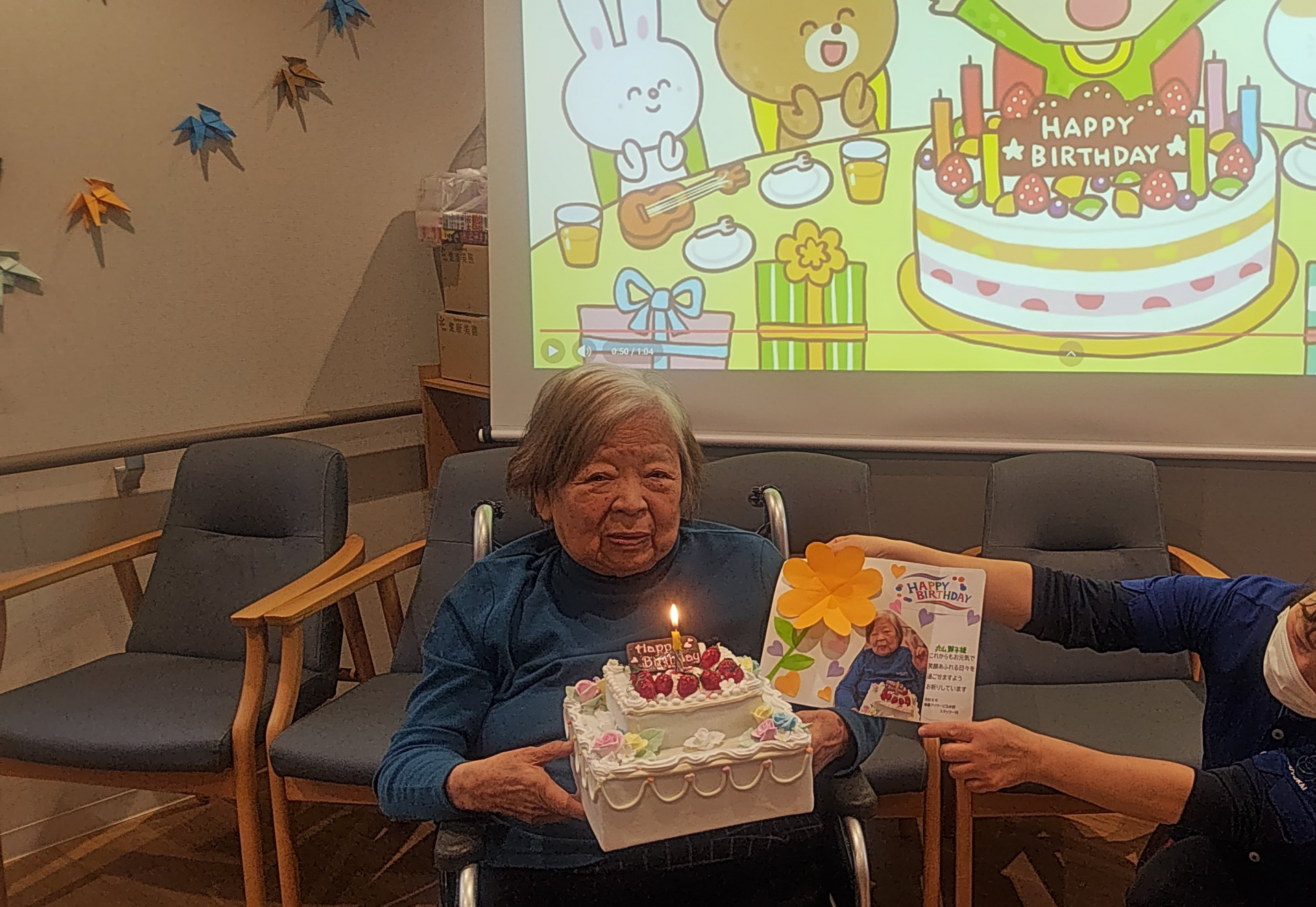 ハッピーバースデーソングをみんなで歌い、職員特製の写真付き、バースデーカードを贈呈させて頂いてます。いくつになっても誕生日を祝われるのは嬉しいものですよね. お誕生日おめでとうございます!