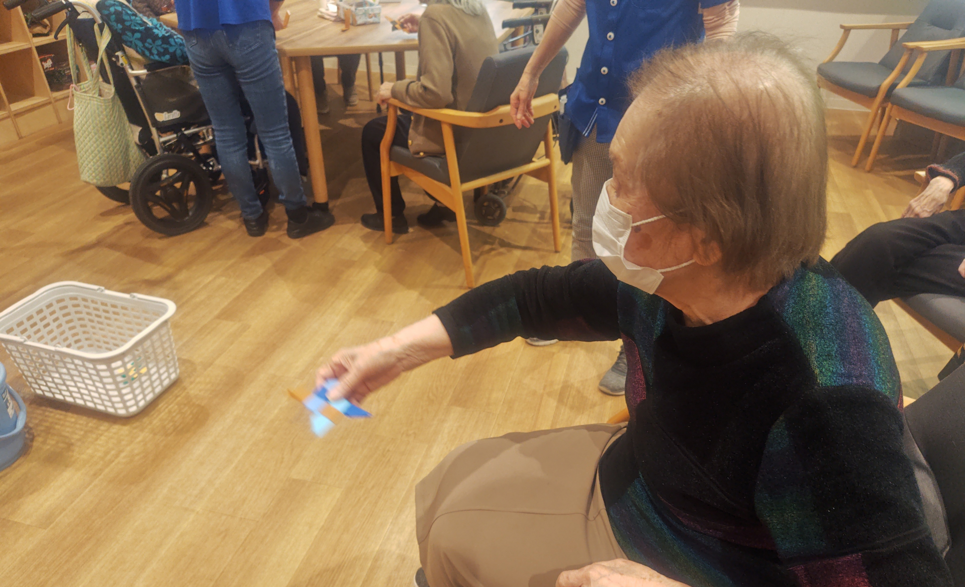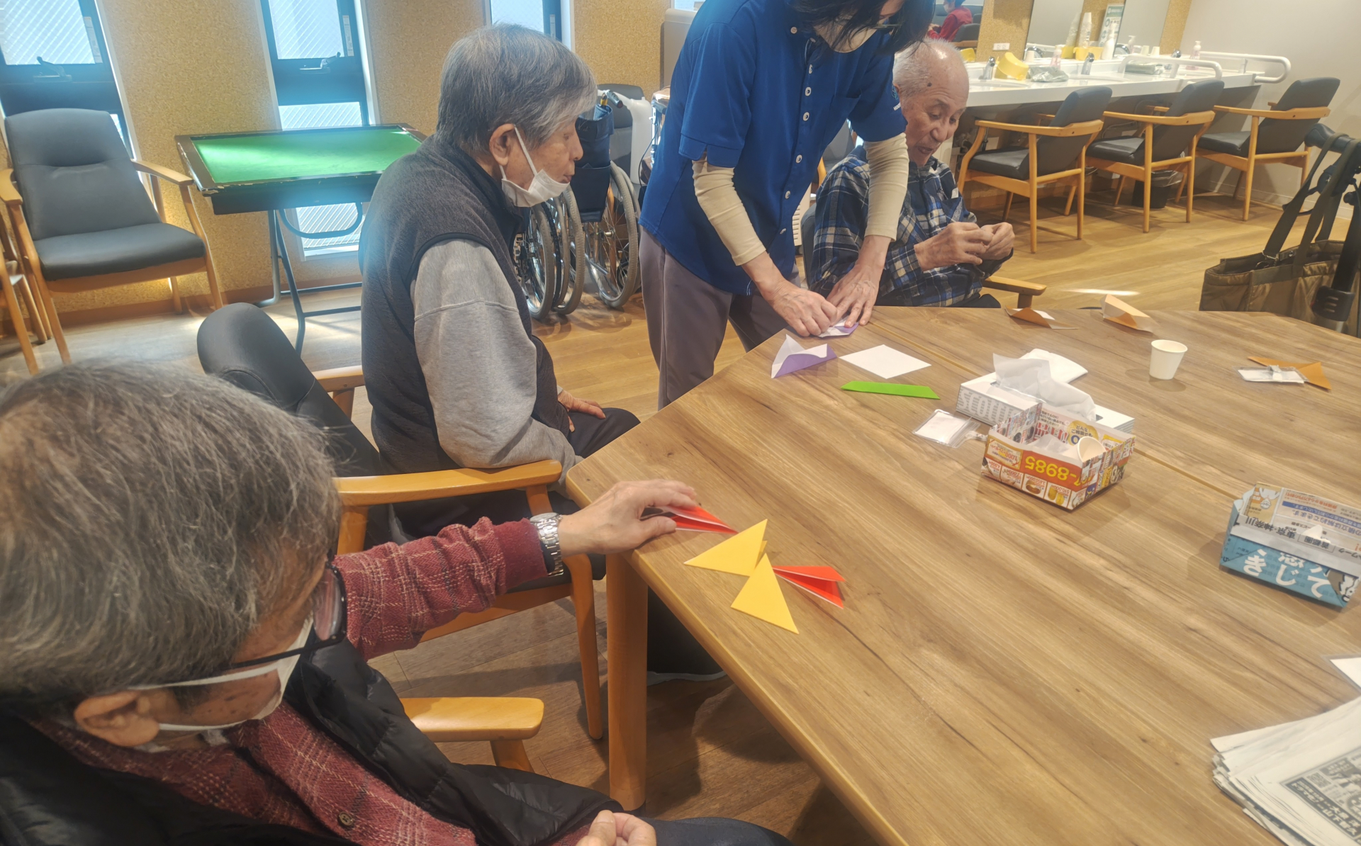 まず皆様に、色々な折り紙で「手裏剣」を作って頂きました。男性陣も職員に手伝ってもらいながら、手裏剣作りをされています(笑)