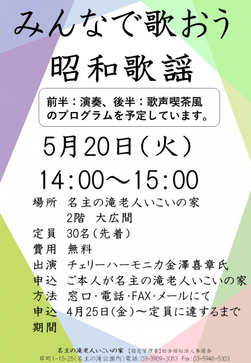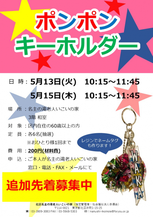 2025.05.08 お散歩バックお持ち下さいました 活動報告 2025.05.08 追加募集中! お知らせ 2025.05.07 みんなでボッチャ開催致しました 活動報告 2025.05.05 ちりめんで五月人形② 活動報告 2025.05.04 みどりの日の「名主の滝老人いこいの家」 高齢者福祉センター 2025.05.04 アンチエイジングヨガ開催致しました 活動報告 2025.05.01 5月もみんなでe-スポーツ開催致します お知らせ 2025.05.01 5月もみんなでボッチャ開催致します お知らせ 2025.05.01 空手ビクス本日よりお申込み開始致します 活動報告 2025.04.29 スマホ交流会「カメラを使いこなす!」を行いました 活動報告 2025.04.27 手話講座二回目実施いたしました。 活動報告 2025.04.27 ベリーダンス&タヒチアンダンスショー開催致しました 活動報告 2025.04.27 はじめてのヨガ教室開催致しました 活動報告 2025.04.25 ちりめんで五月人形① 活動報告 2025.04.25 みんなで歌おう昭和歌謡申込み開始致します お知らせ 1 … 23 24 25 26 27 … 58