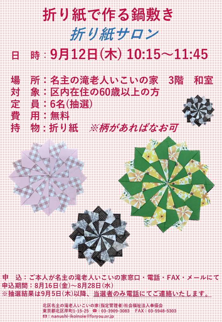 2024.08.27 お知らせ 【折り紙サロン】折り紙で作る鍋敷き申込受付中 Tweet シェアする 折り紙で作る鍋敷き 募集中です。 16枚の折り紙を使って作ります。 ご参加お待ちしています。 名主の滝老人いこいの家 M 前の記事 2024.08.27 お知らせ 『健康食品との安心・安全・上手なかかわり方』開催しました 次の記事 2024.08.25 お知らせ 【フラダンス教室】本日よりお申込み開始致します 一覧へ戻る