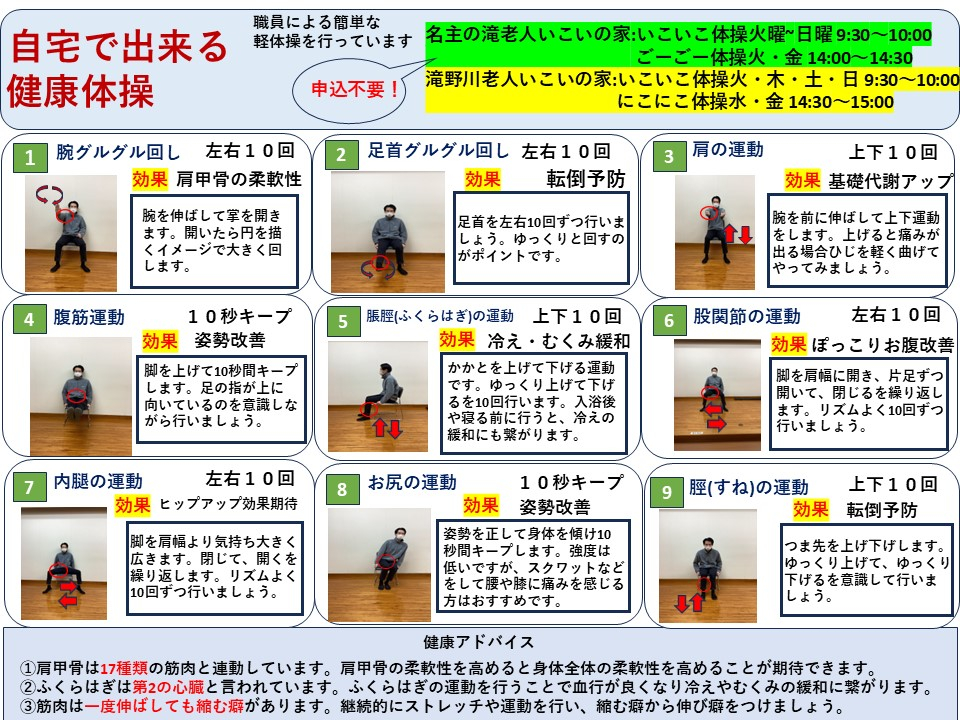 「自宅で出来る健康体操」をテーマに9種類の運動を解説しております。