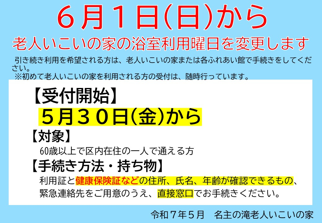 老人いこいの家の浴室利用曜日のご変更のお知らせ