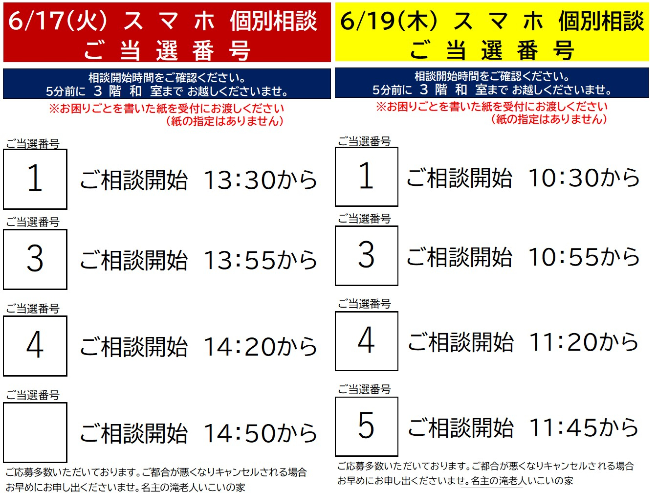6月「スマホ個別相談」の抽選結果を発表させていただきます。