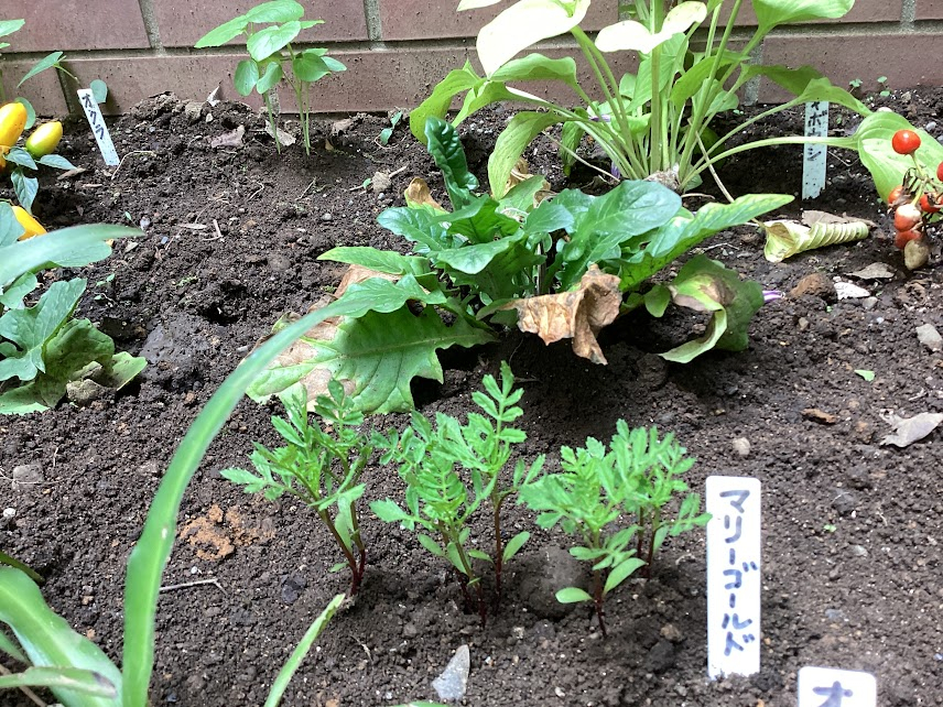 オクラやマリーゴールドも何とか枯れずにがんばってくれています!