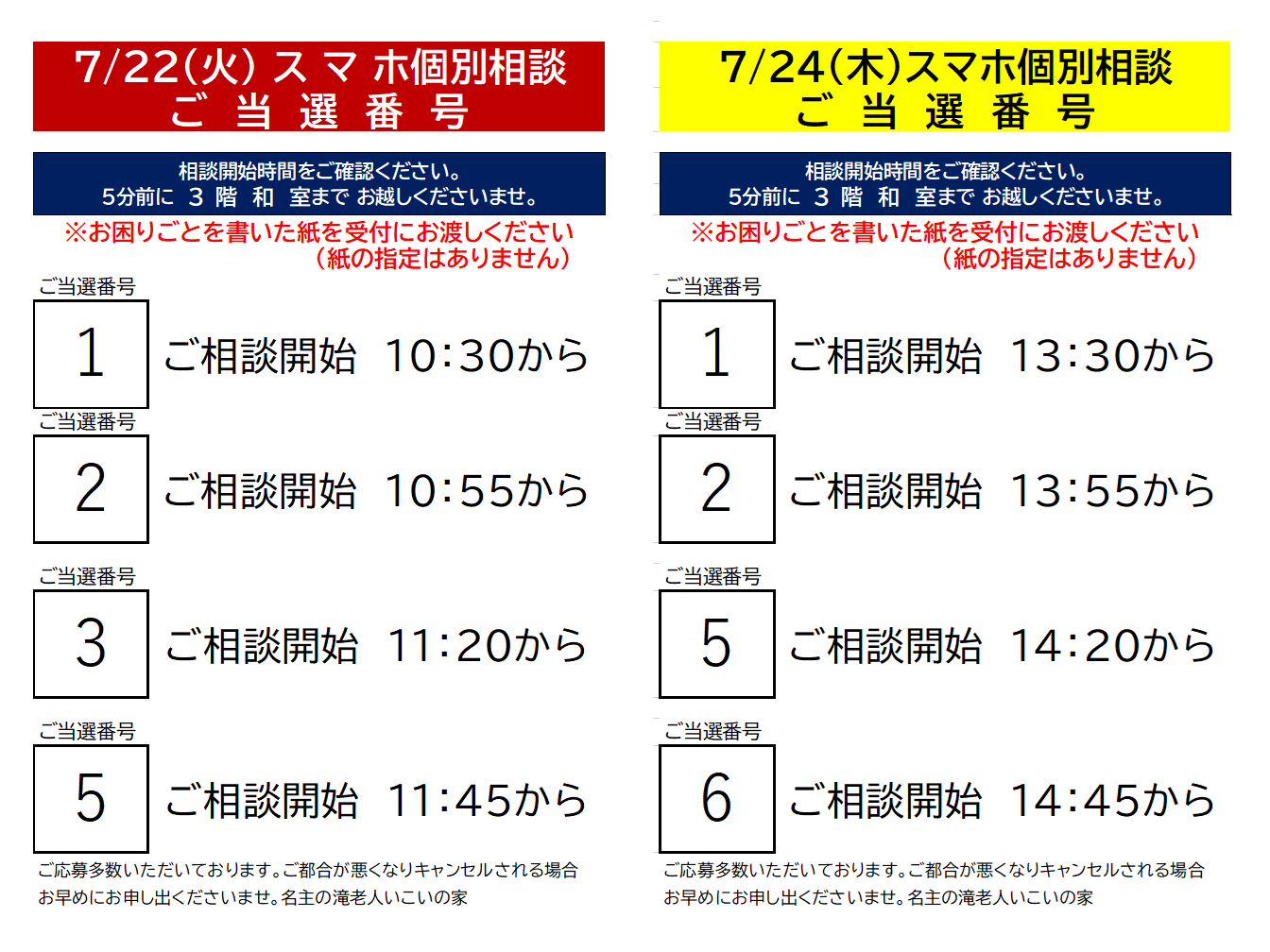 7月のスマホ個別相談の抽選結果を発表させていただきます。