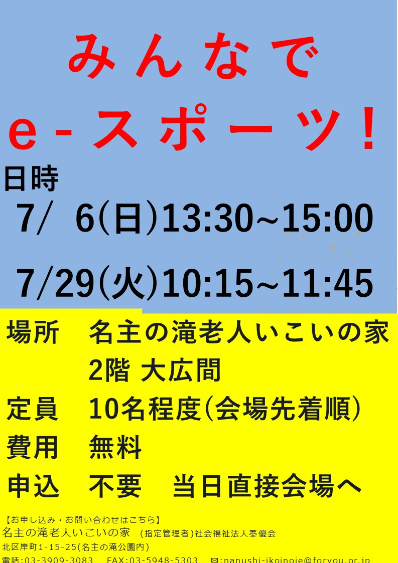 2025.07.08 活動報告 7月もみんなでe-スポーツ開催致します Tweet シェアする 7月もみんなでe-スポーツ開催致します。 初めての方も丁寧に教えていきますので、お気軽にご参加くださいませ。 詳細は以下をご覧ください。 名主の滝老人いこいの家 藤原 前の記事 2025.07.09 活動報告 7月4日折り紙で作るメモケース講座の様子 次の記事 2025.07.08 活動報告 花壇の整備始めました⑫ 一覧へ戻る
