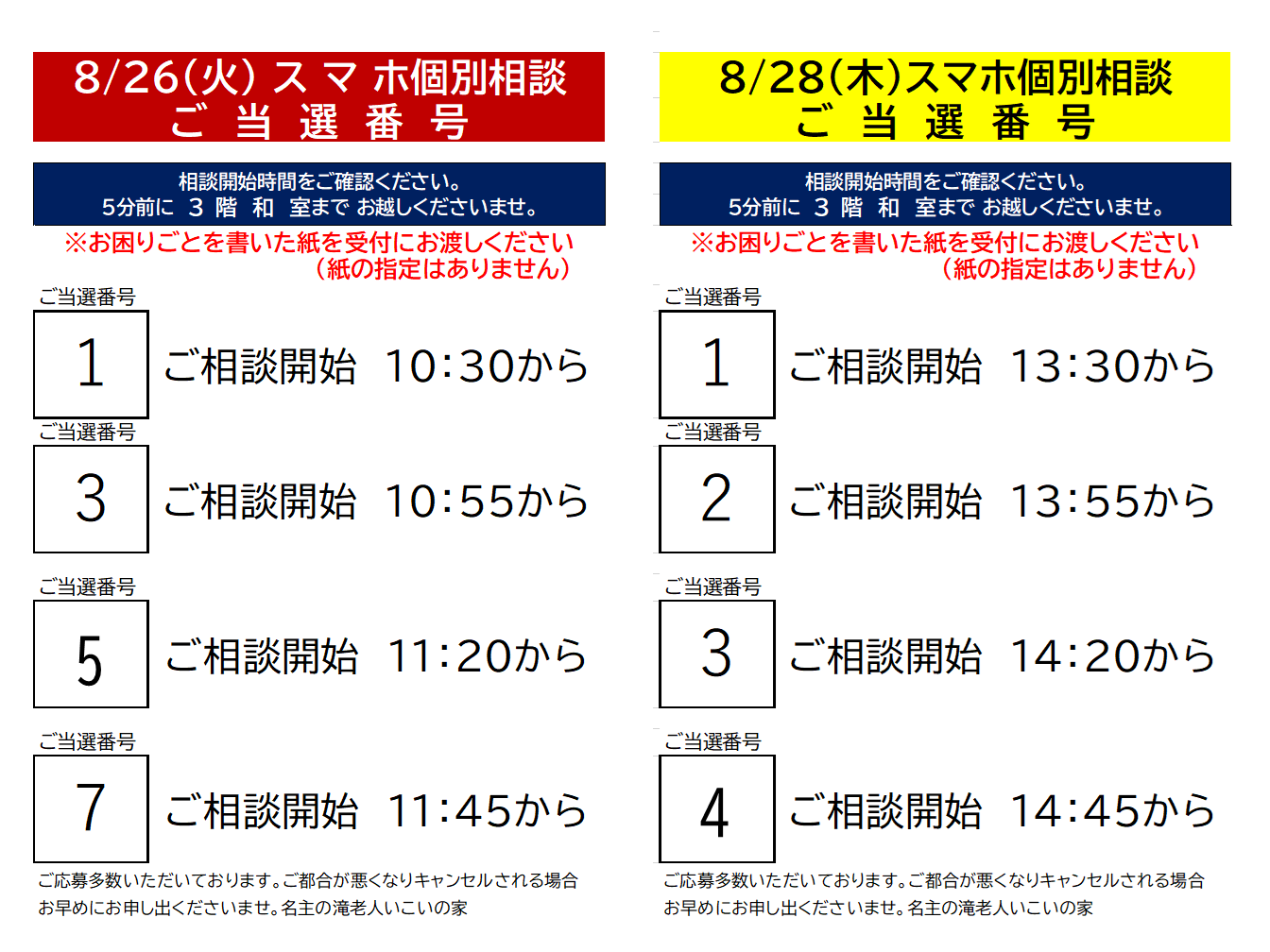 8月のスマホ個別相談の抽選結果を発表させていただきます。