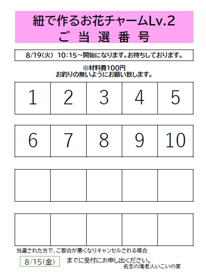 8月開催『紐で作るおはなチャームLv.2』講座の抽選結果をお知らせします。