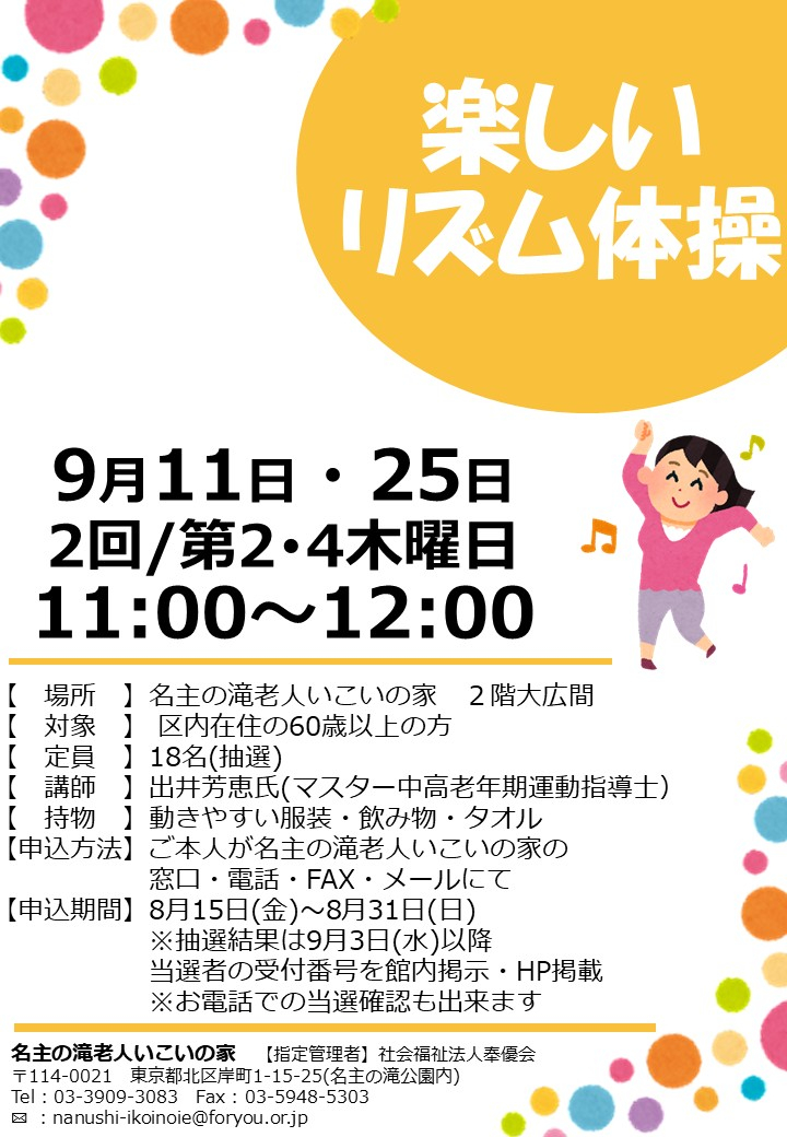 2025.08.15 お知らせ 楽しいリズム体操申込開始致します Tweet シェアする 本日より楽しいリズム体操お申込み開始致します。 音楽に合わせて楽しく身体を動かしましょう。 沢山のお申込み心よりお待ちしております。 詳細は以下をご覧くださいませ。 名主の滝老人いこいの家 藤原 前の記事 2025.08.16 お知らせ 花壇の整備始めました⑰ 次の記事 2025.08.14 お知らせ 【当選発表】「8月かんたん英会話」抽選結果のお知らせ 一覧へ戻る