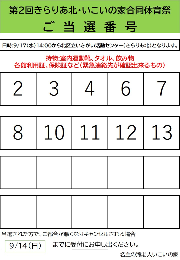「第2回きらりあ北・いこいの家合同体育祭」抽選結果を発表させていただきます。