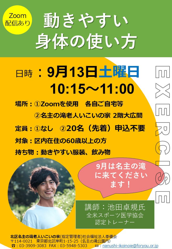 2025.09.01 活動報告 動きやすい身体の使い方を学ぼう Tweet シェアする 今回は池田卓規氏が名主の滝に来て指導してくださいます。身体や動作の基本について学び、夏バテの身体のメンテナンスをしましょう! YM 前の記事 2025.09.02 活動報告 「ソフトチェアロビ」募集開始いたしました 次の記事 2025.08.31 活動報告 花壇の整備始めました⑱ 一覧へ戻る