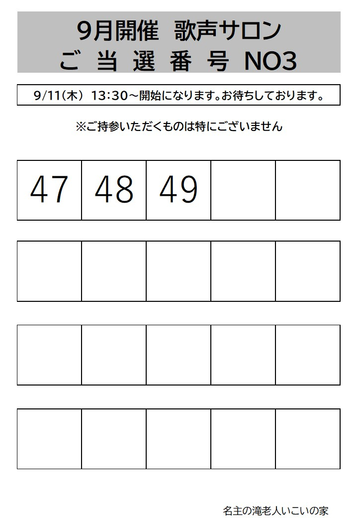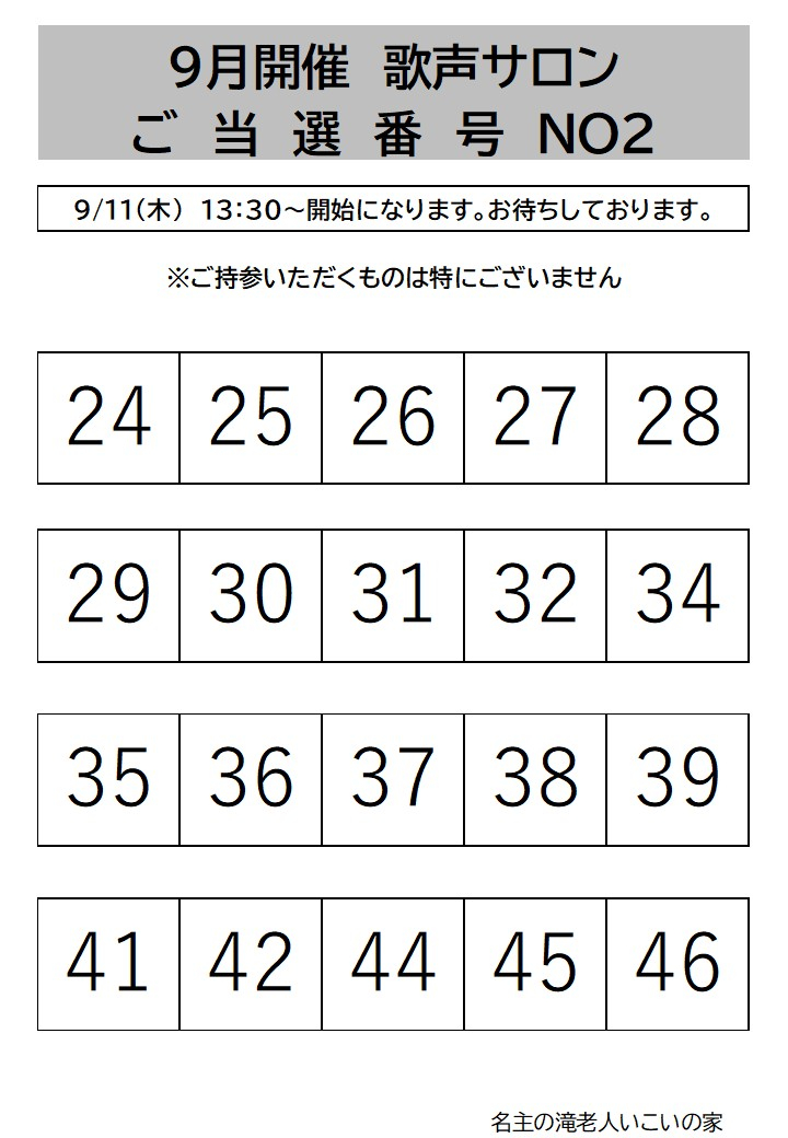 9月開催歌声サロンの抽選結果を発表させていただきます。