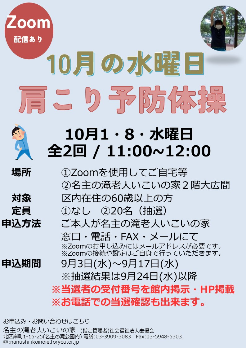 2025.09.03 お知らせ 肩こり予防体操申込み開始となります Tweet シェアする 10月に開催されます「肩こり予防体操」申込み開始致します。 大変人気なお教室となっておりますので是非お申込みくださいませ。 詳細は以下をご覧くださいませ。 名主の滝老人いこいの家 藤原 前の記事 2025.09.04 お知らせ 【当選発表】「9月開催歌声サロン」抽選結果のお知らせ 次の記事 2025.09.03 お知らせ 【当選発表】「楽しいリズム体操」抽選結果のお知らせ 一覧へ戻る