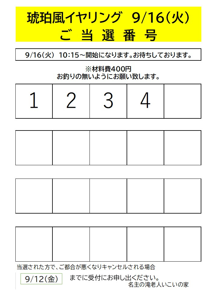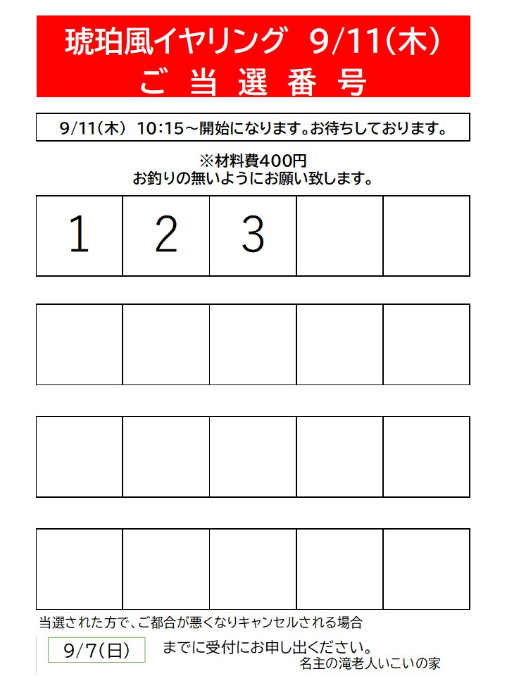 「琥珀風イヤリング」講座の抽選結果を発表させていただきます。