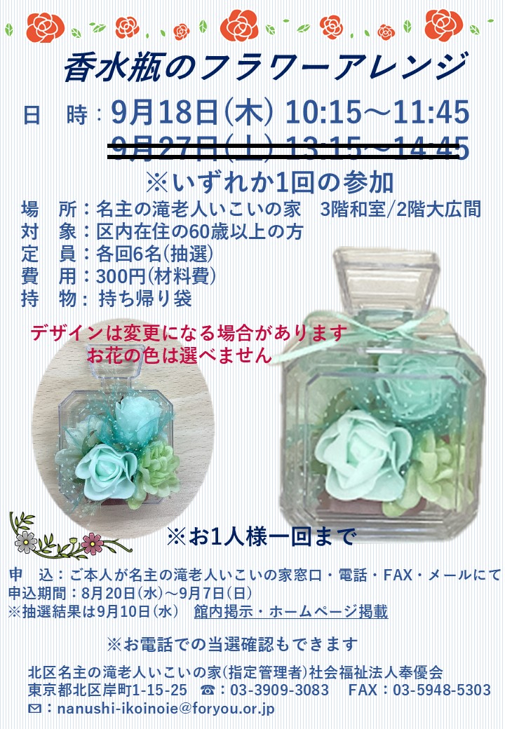2025.09.12 お知らせ 【追加募集中】香水瓶のフラワーアレンジ Tweet シェアする 9月18日(木)香水瓶のフラワーアレンジ 3名、追加募集中です。 先着順となります。ご参加お待ちしております。 名主の滝老人いこいの家 M 前の記事 2025.09.12 お知らせ みんなでe-スポーツ開催致しました 次の記事 2025.09.12 お知らせ 【当選発表】「初心者でも出来る練功十八法」抽選結果のお知らせ 一覧へ戻る