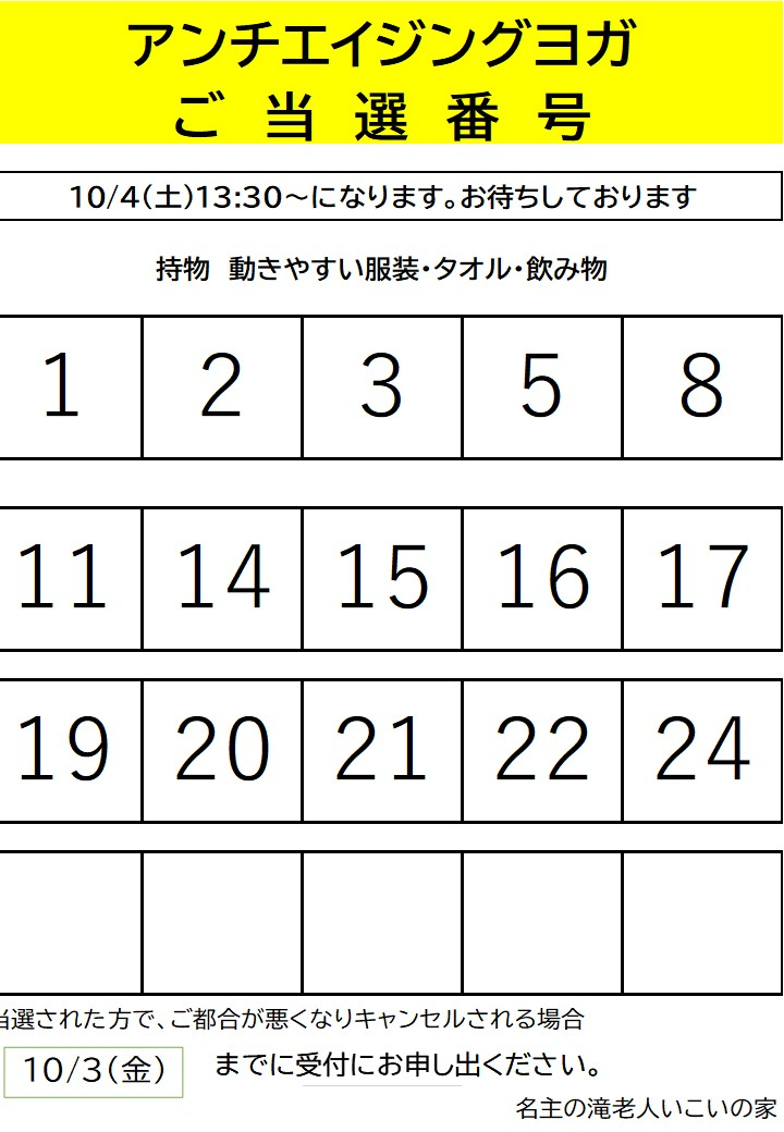 「アンチエイジングヨガ」抽選結果を発表させていただきます。