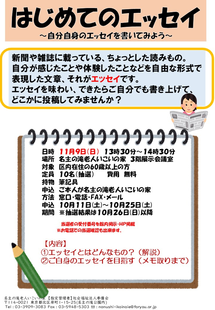 講座「はじめてのエッセイ」の受付が10月11日より始まりました。