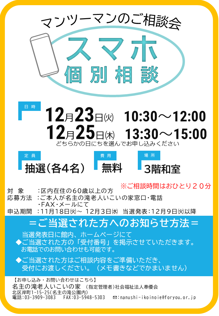 2025.11.18 お知らせ 12月「スマホ個別相談」受付開始しました。 Tweet シェアする 12月開催のスマホ個別相談の受付が始まりました。 くわしくはポスターをご覧くださいませ 名主の滝老人いこいの家 S 前の記事 2025.11.19 お知らせ 刺繍糸で編む可愛いモチーフ開催致しました① 次の記事 2025.11.15 お知らせ アンチエイジングヨガ開催致しました 一覧へ戻る