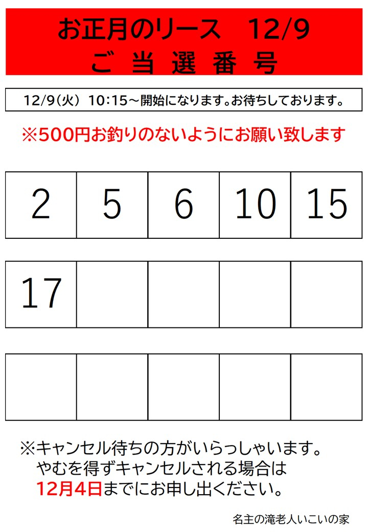 12月9日開催のお正月のリース抽選結果を発表させていただきます。