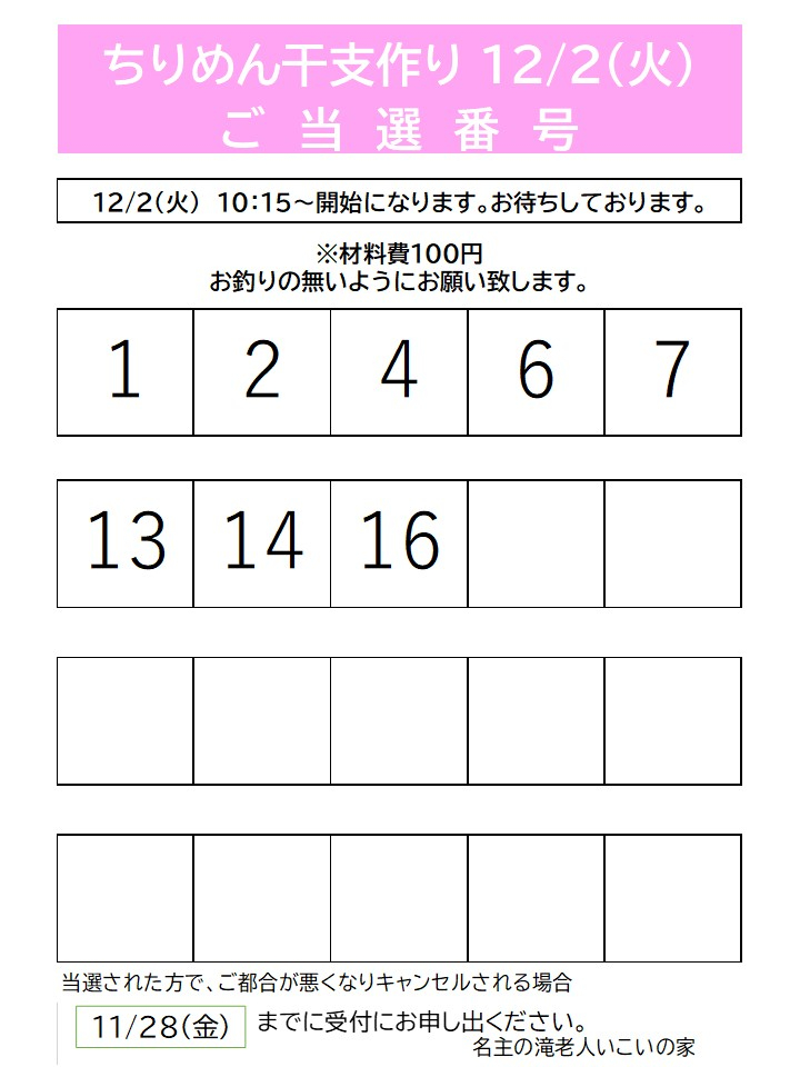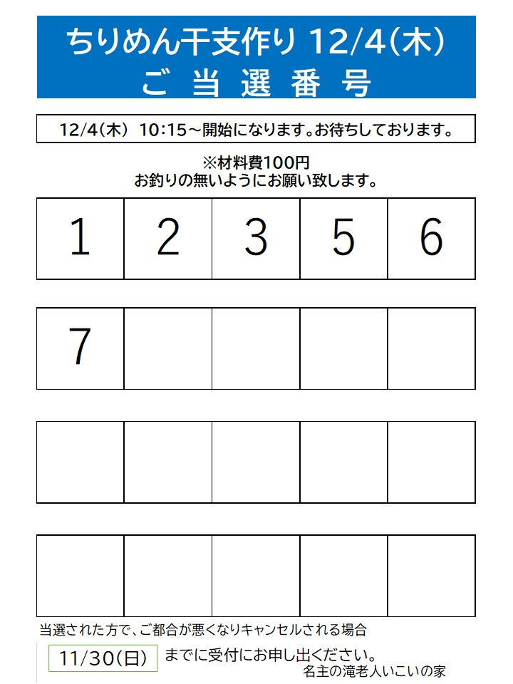 12月開催ちりめんで干支作り講座の抽選結果を発表させていただきます。