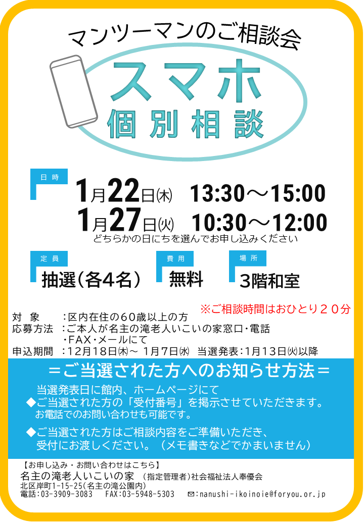 2025.12.18 お知らせ 1月のスマホ個別相談の受付開始しました Tweet シェアする 1月のスマホ個別相談の受付開始しました。 くわしくはポスターをごらんくださいませ 名主の滝老人いこいの家 S 前の記事 2025.12.18 お知らせ フラダンス教室開催致しました 次の記事 2025.12.18 お知らせ 1月開催 スマホ交流会受付開始しました 一覧へ戻る