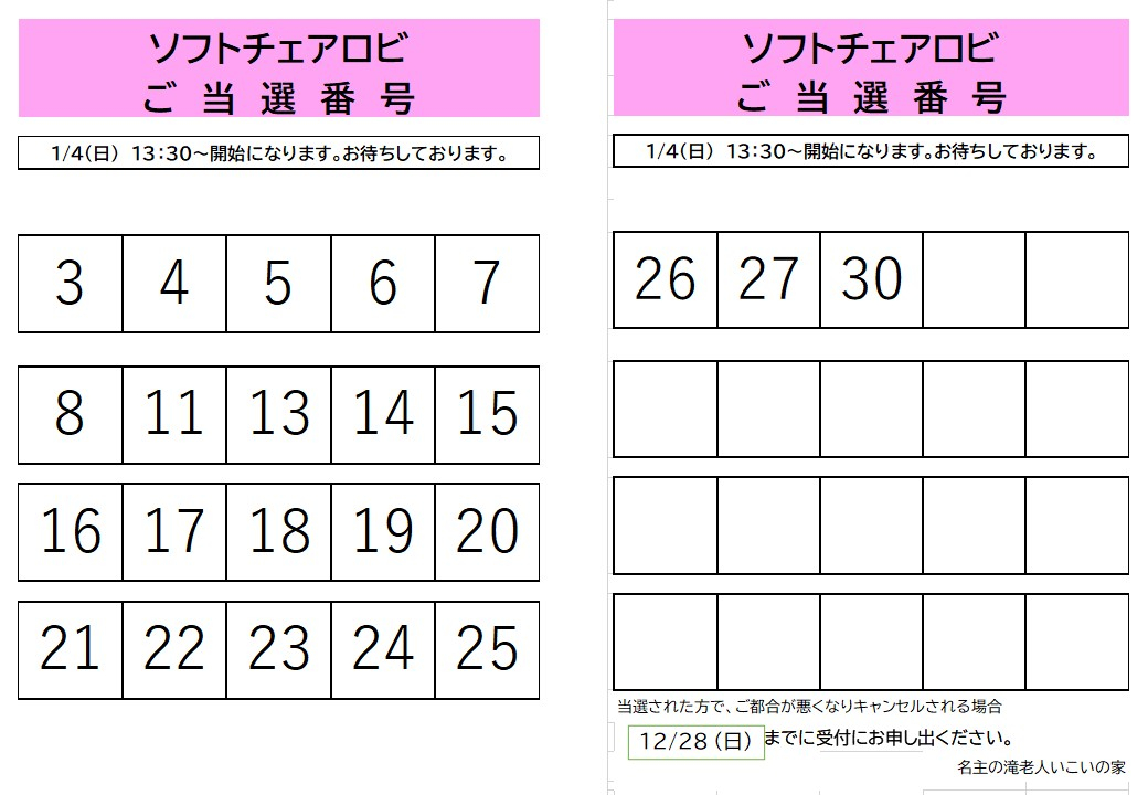 2025.12.21 お知らせ 【当選発表】「ソフトチェアロビ」抽選結果のお知らせ Tweet シェアする 1月開催「ソフトチェアロビ」の抽選結果を発表させていただきます。 お申込みされた方は、ご確認をお願い致します。 ご参加お待ちしています。 名主の滝老人いこいの家 前の記事 2025.12.21 お知らせ 空手ビクス開催致しました 次の記事 2025.12.20 お知らせ 花壇の整備始めました㉒ 一覧へ戻る
