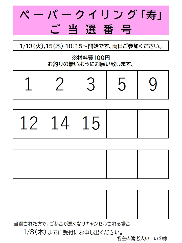 2026.01.06 お知らせ 【当選発表】「ペーパークイリング『寿』」抽選結果のお知らせ Tweet シェアする 1月開催「ペーパークイリング『寿』」の抽選結果を発表致します。 お申込みされた方は、ご確認をお願い致します。 ご参加お待ちしております。 名主の滝老人いこいの家 F.M. 前の記事 2026.01.08 お知らせ みんなでボッチャ開催致しました 次の記事 2026.01.04 お知らせ 新年のご挨拶 一覧へ戻る